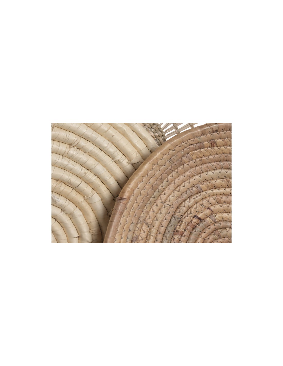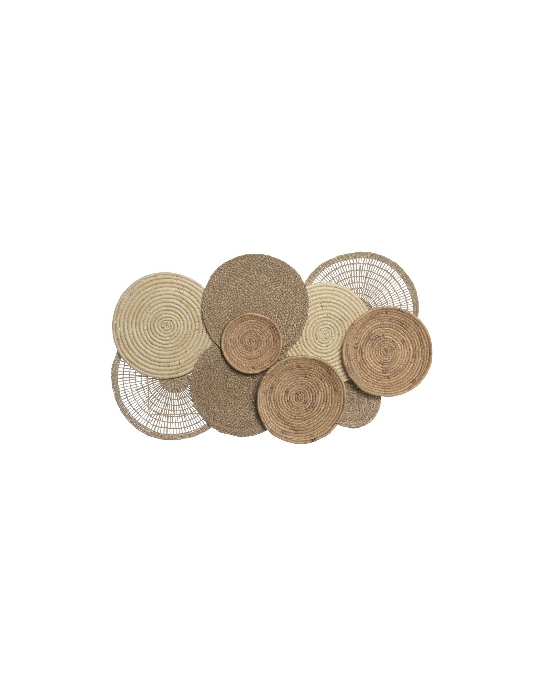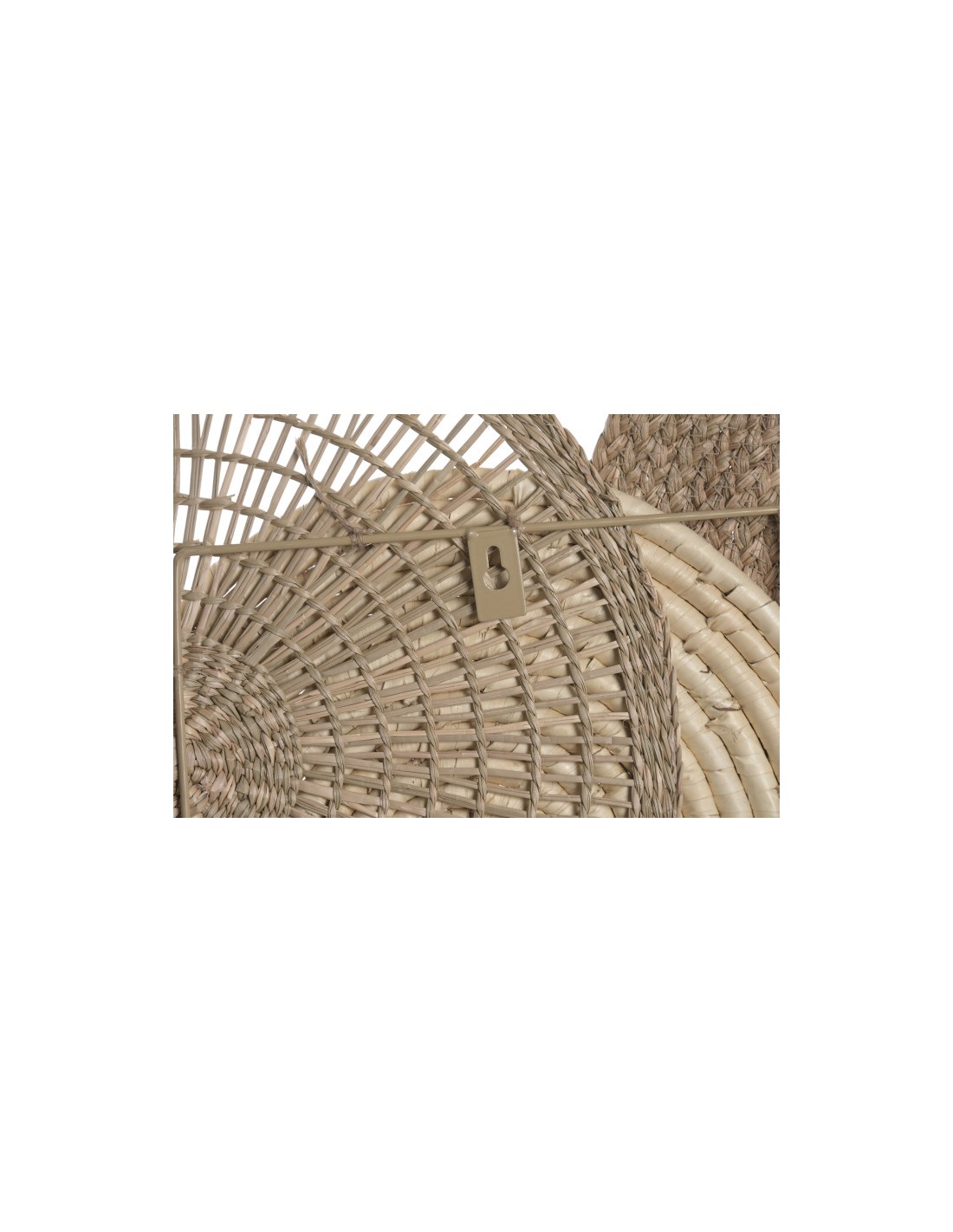 Esta decoración de pared está fabricada con seagrass y jacinto de agua, materiales naturales muy valorados en decoración por su textura, su resistencia y su capacidad para crear ambientes acogedores. Su diseño sencillo y elegante permite integrarla fácilmente en diferentes estilos decorativos, desde ambientes modernos hasta espacios más rústicos o boho.