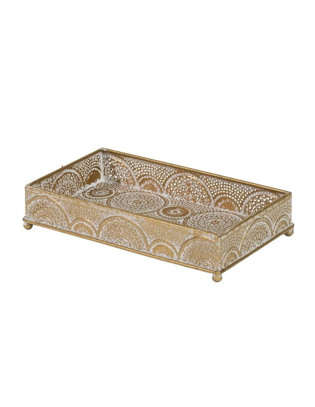 Esta bandeja decorativa fabricada en metal presenta un delicado diseño calado con acabado en color oro envejecido, aportando un toque clásico y sofisticado a cualquier espacio del hogar.