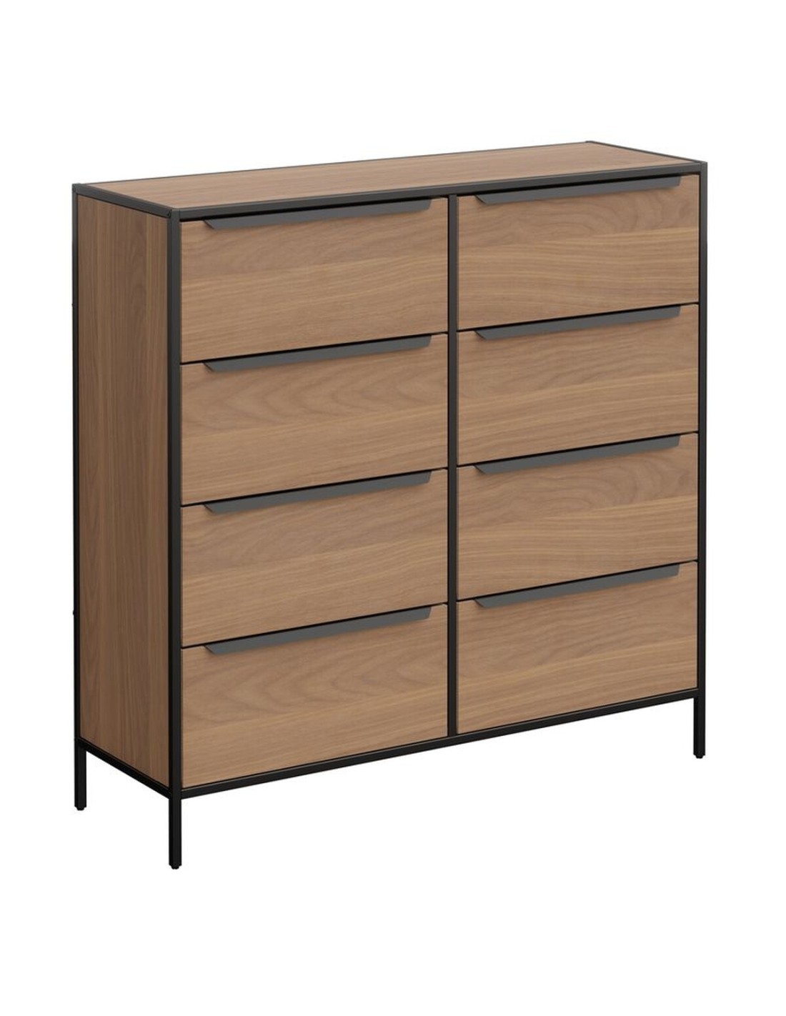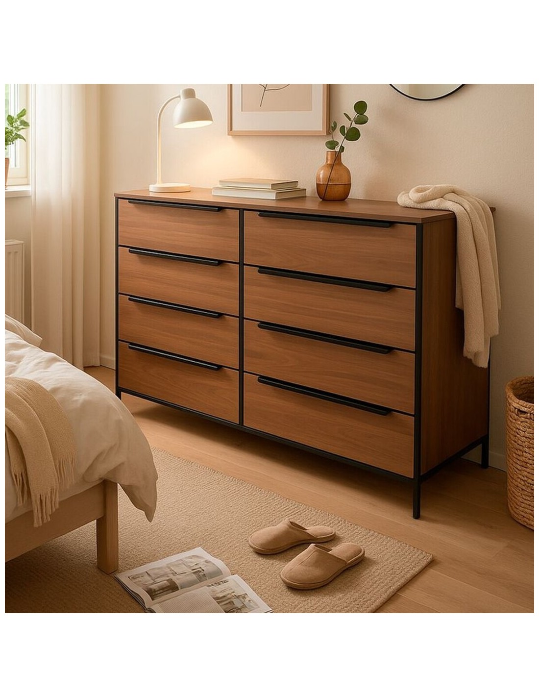 Práctica y elegante cómoda de madera DM en color roble, diseñada con 8 cajones de tela con frontal de madera que ofrecen gran capacidad de almacenaje. Su diseño moderno y funcional la convierte en una opción ideal para cualquier estancia del hogar.