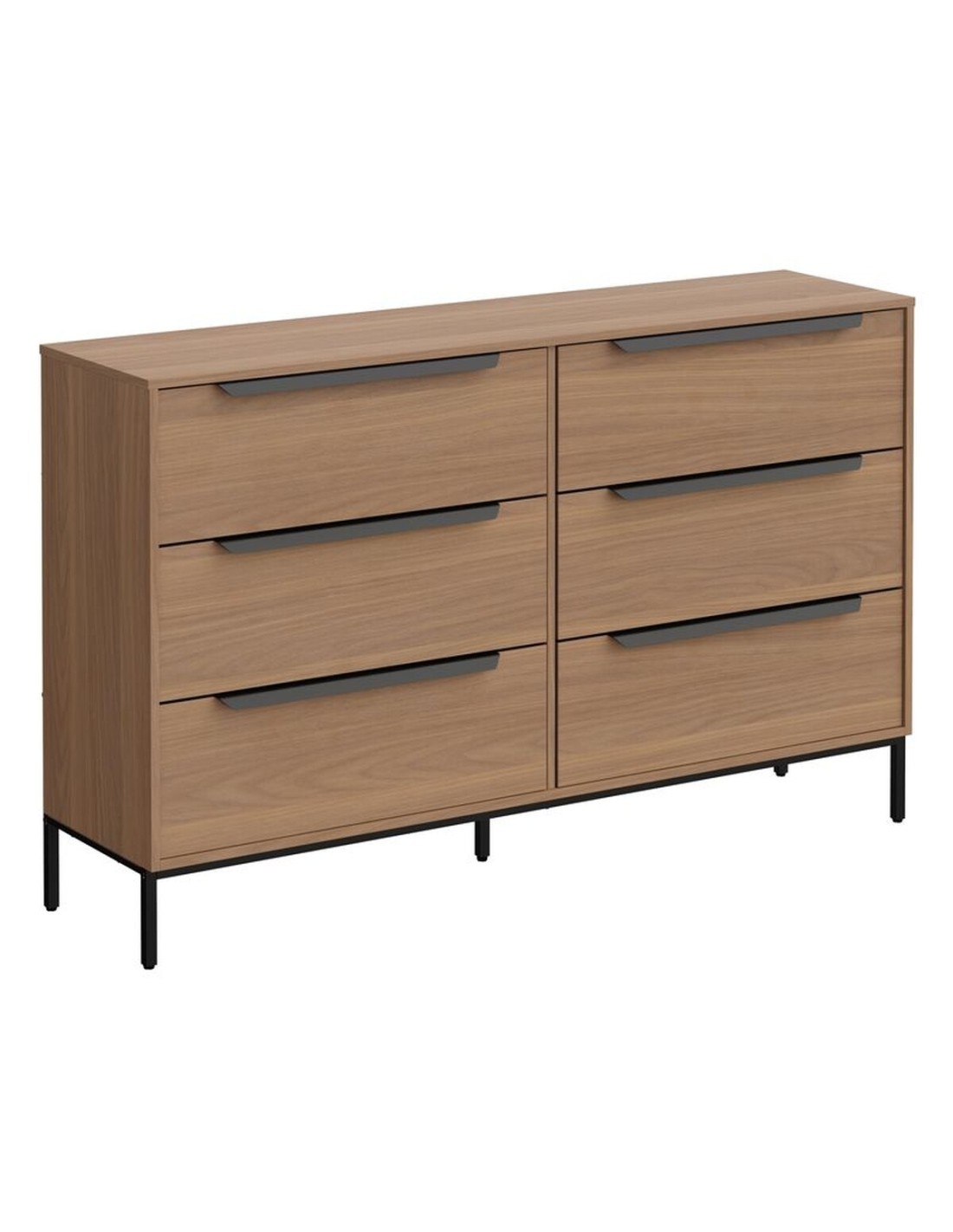 Cómoda 6 cajones color roble de madera DM con base metálica.