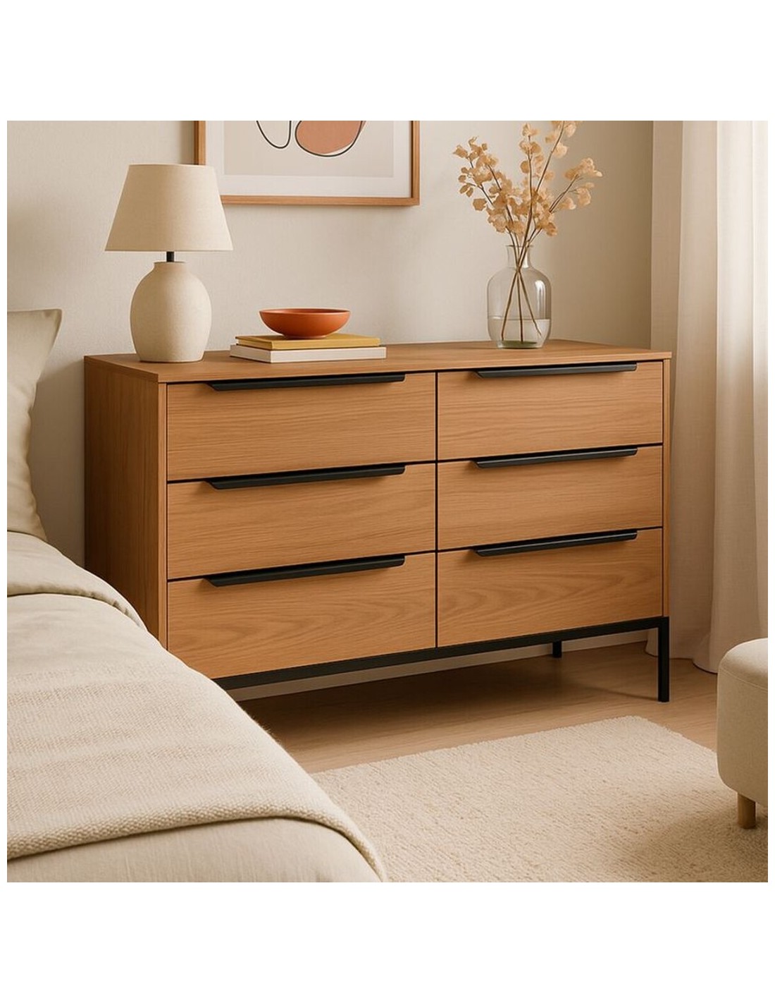 Esta cómoda en color roble con base metálica es perfecta para combinar resistencia, diseño y practicidad. Sus 6 cajones ofrecen un amplio espacio de almacenaje manteniendo la estancia ordenada, mientras que su base metálica en negro añade un estilo moderno e industrial. Gracias a su diseño versátil, puede colocarse en dormitorios, entradas o salones, aportando un mueble funcional y decorativo al mismo tiempo. Una opción ideal para quienes buscan organización con estilo.