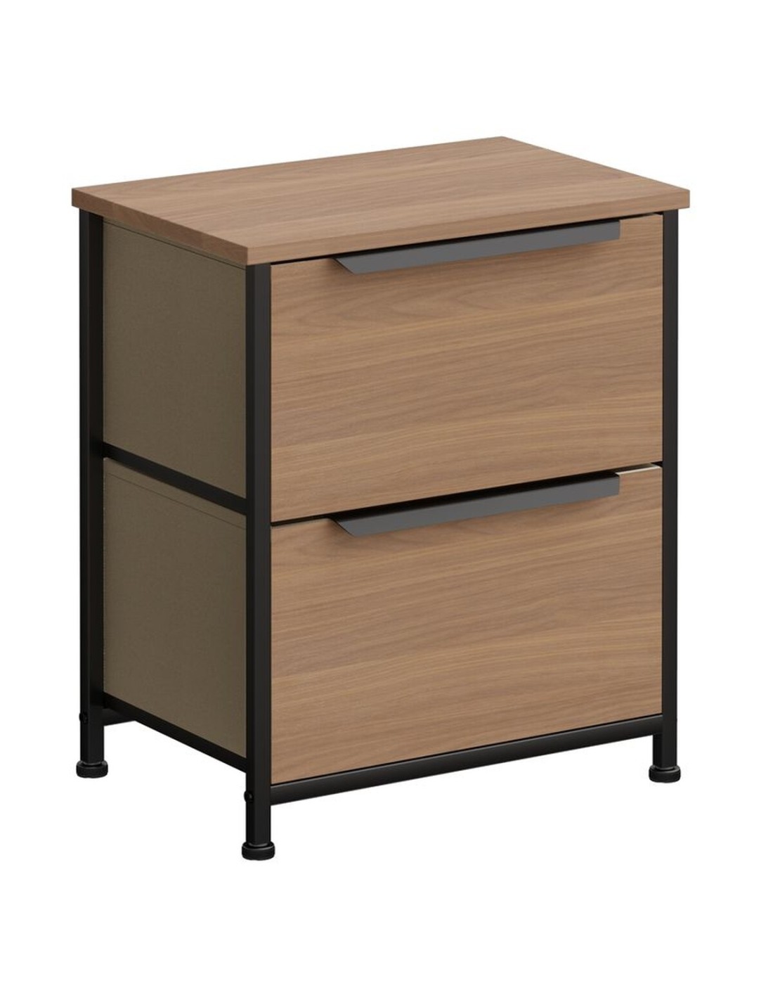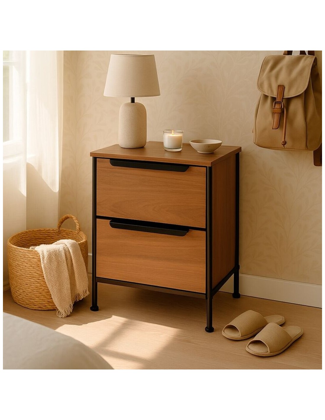 Práctico mueble auxiliar fabricado en madera DM en color roble con base de metal pintada en negro. Incluye 2 cajones de tela con frontal de madera, ideal para aportar un toque moderno y funcional a tu hogar sin ocupar demasiado espacio.