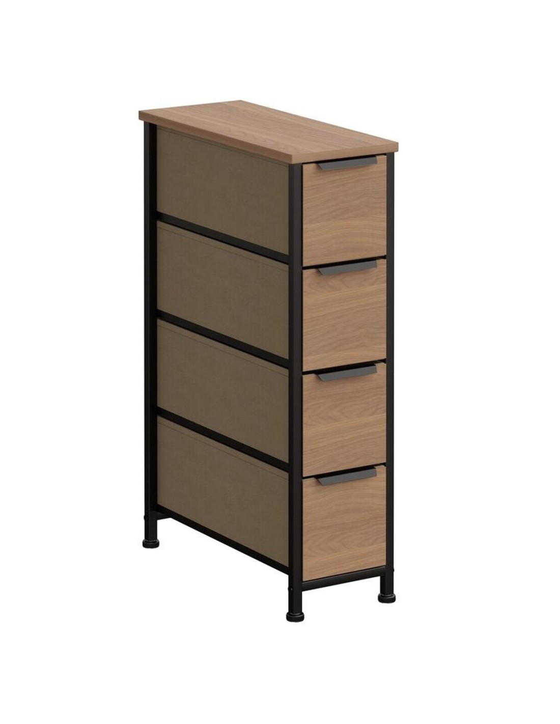 Funcional y compacto mueble estrecho fabricado en madera DM, diseñado con una base de metal pintada en negro que aporta resistencia y un estilo moderno. Incorpora 4 cajones de tela con frontal de madera, ideales para mantener el orden en espacios reducidos sin perder elegancia.