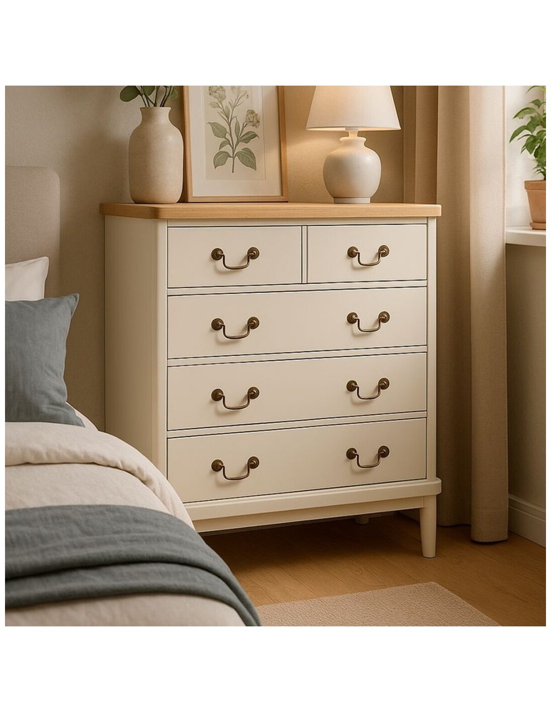 Elegante cómoda fabricada en madera con un delicado acabado en color crema que aporta luminosidad y calidez a cualquier estancia. Cuenta con 4 amplios cajones que ofrecen un excelente espacio de almacenaje. Su base en tono madera natural y los tiradores metálicos en color dorado añaden un toque sofisticado y moderno, perfecta para dormitorios o salones.