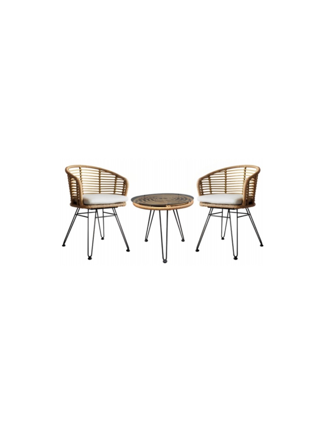 Este set está compuesto por una mesa y dos sillas fabricadas en ratán sintético, un material resistente y de fácil mantenimiento, ideal para exteriores. Las sillas incluyen cojines que aportan mayor confort, permitiendo disfrutar de momentos de descanso o reuniones al aire libre.