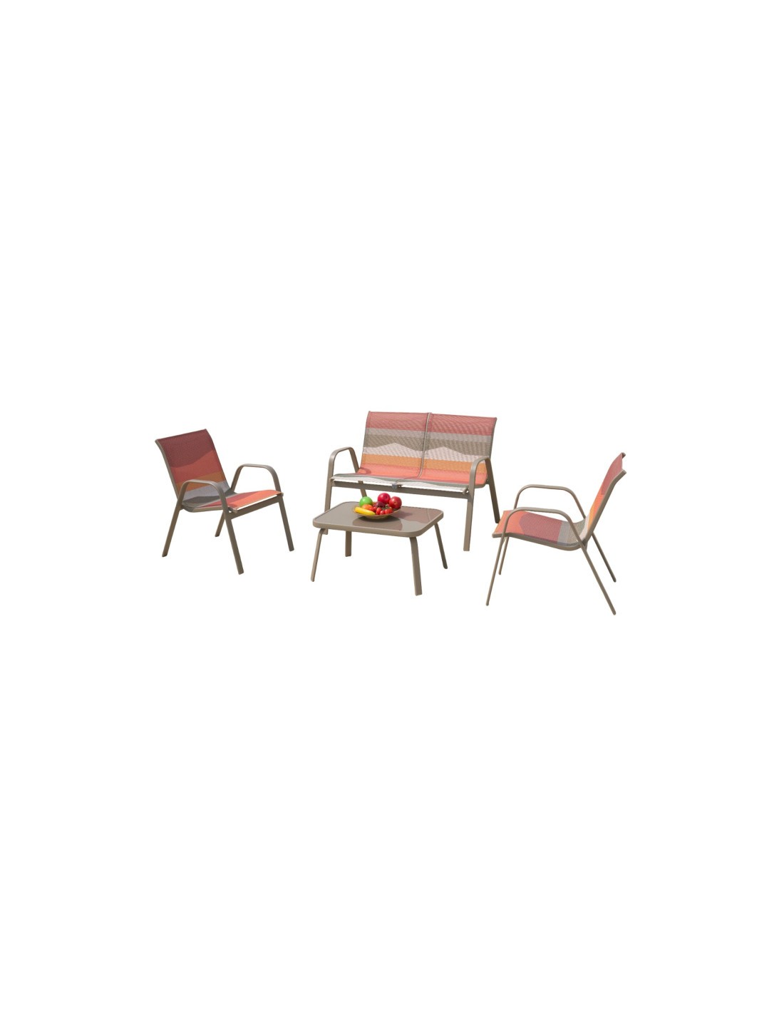 Este set está compuesto por una mesa, dos sillas y un sofá, fabricados en acero con acabado en poliéster, lo que garantiza resistencia y durabilidad. Su diseño tipo sunset aporta un toque moderno y relajado, perfecto para crear ambientes acogedores.