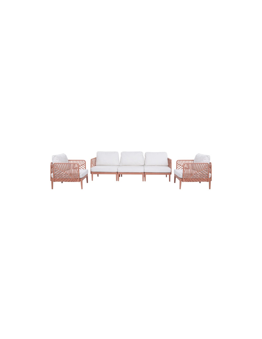 Este set está compuesto por un sofá, dos sillones y una mesa, fabricados en poliéster en color hoja terracota, un material cómodo, resistente y fácil de mantener. Su diseño combina funcionalidad y estética, creando un conjunto perfecto para el descanso al aire libre.