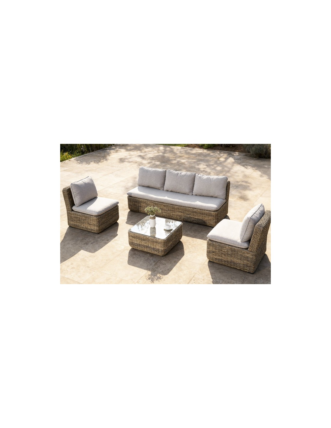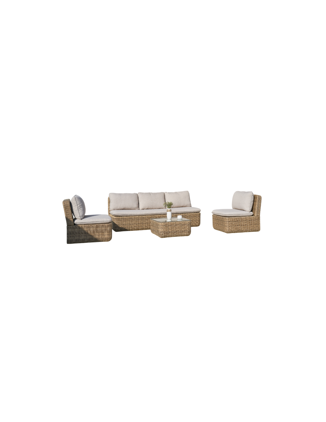 Este set está compuesto por un sofá, dos sillones y una mesita, fabricados en ratán sintético con estructura de aluminio. Esta combinación ofrece una gran resistencia a las condiciones exteriores, además de un acabado moderno y elegante.