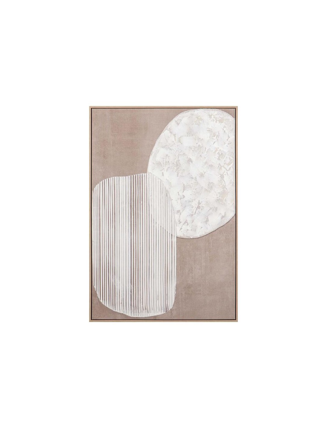 Cuadro abstracto pintado sobre lienzo con un diseño artístico moderno y elegante, ideal para quienes buscan una pieza decorativa única y con personalidad. Esta obra está pintada a mano en un 50%, lo cual le aporta textura, profundidad y carácter, haciendo que cada pieza tenga ligeras variaciones que la convierten en un artículo especial y único. Además, viene cuidadosamente enmarcada con una estructura de madera de pino en color natural, lo que le añade un acabado cálido, ligero y muy actual, perfecto para combinar en ambientes contemporáneos, modernos o incluso rústico chic. Sus medidas de 83 cm x 123 cm lo convierten en un cuadro de gran presencia visual, ideal para paredes amplias donde se busca un punto focal que atraiga la mirada.