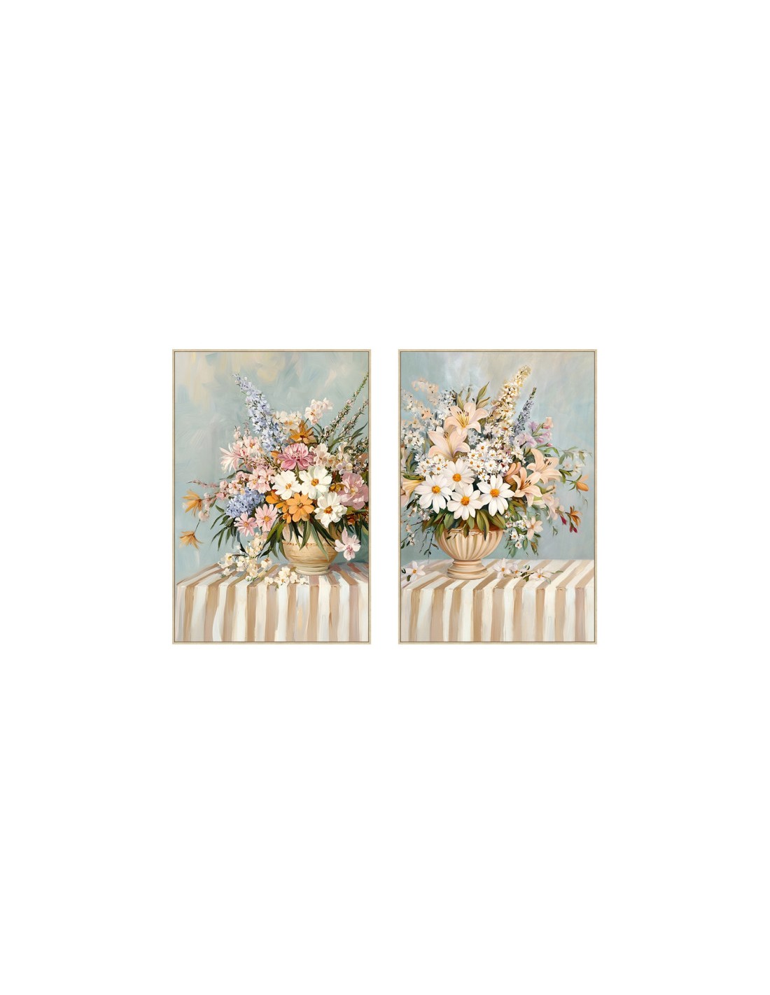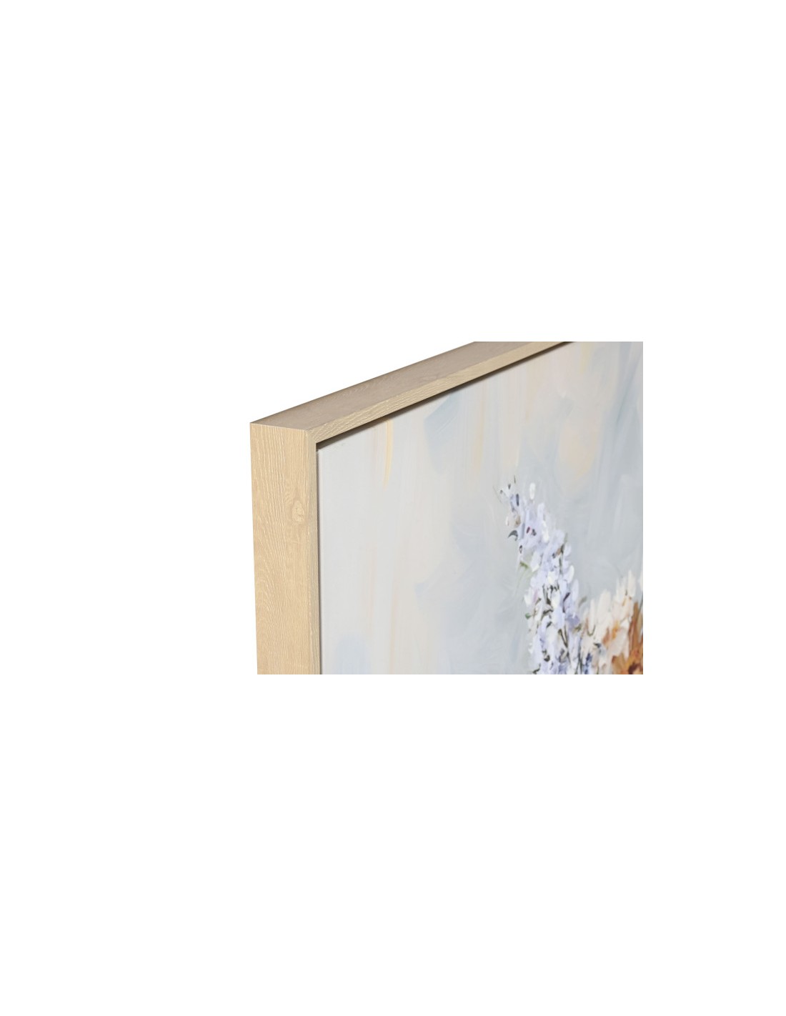 Embellece tu hogar con este cuadro pintado sobre lienzo con diseño de floreros de mesa con flores, una pieza artística que combina elegancia y naturalidad. Enmarcado en madera de abeto en color natural, este cuadro destaca por su estilo cálido y su composición detallada, perfecta para aportar vida y color a cualquier estancia.