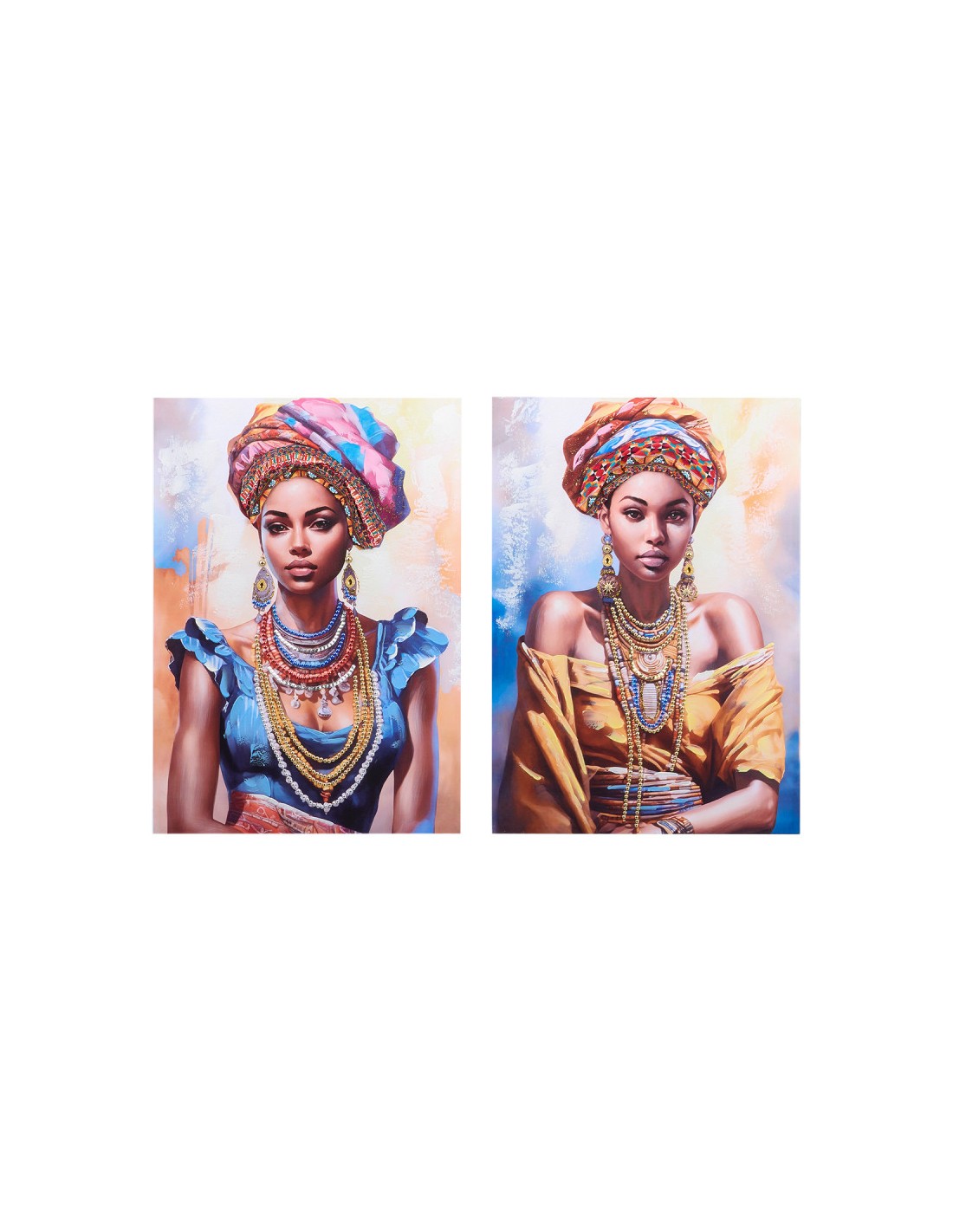 Este cuadro pintado sobre lienzo con diseño de mujer incorpora delicados adornos en tela y un collar en relieve que aportan textura y profundidad a la obra. Su combinación de pintura y elementos en relieve crea un efecto visual sofisticado, ideal para destacar en cualquier estancia del hogar.