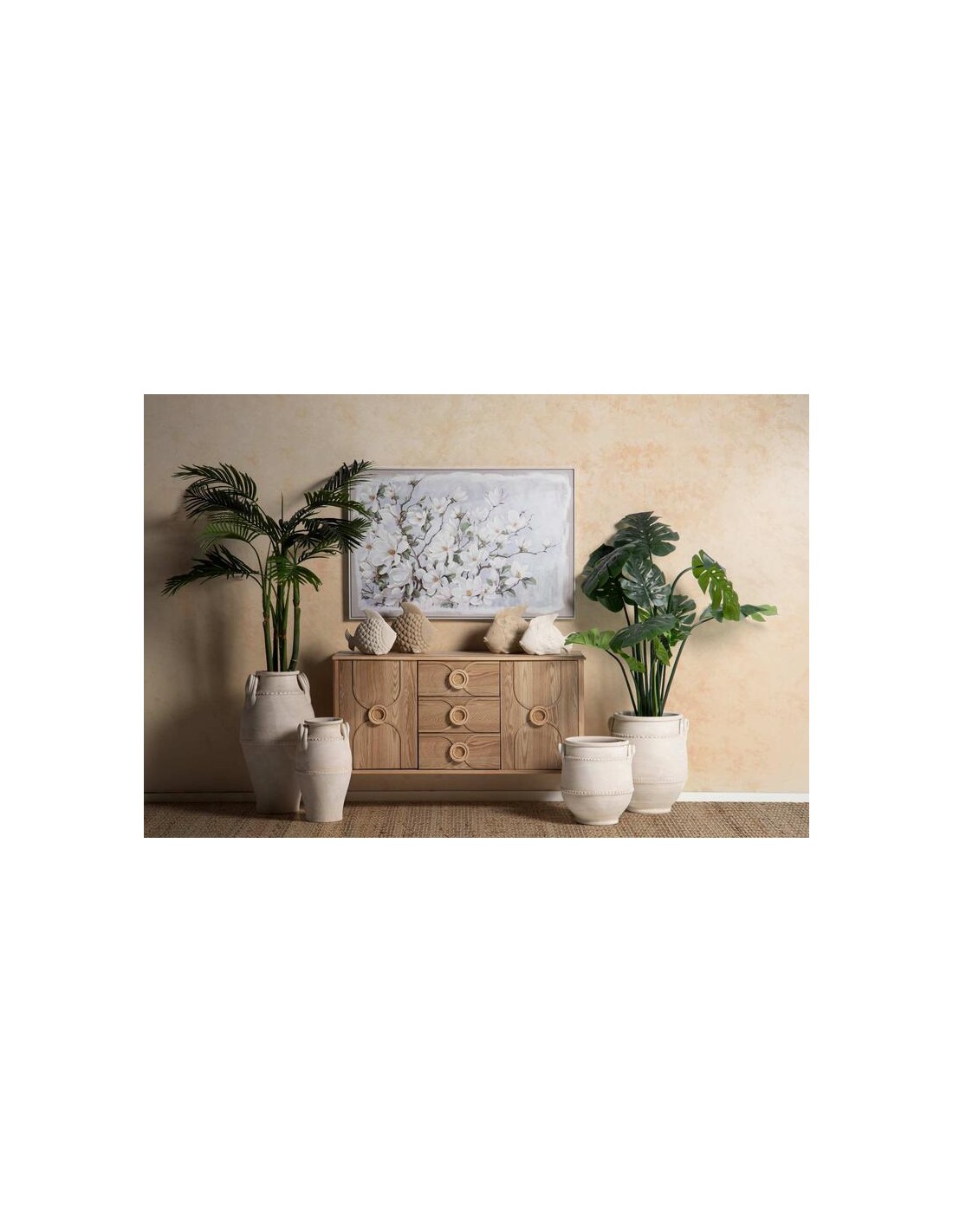 Es ideal para colocar en salones, dormitorios, recibidores o pasillos, aportando un ambiente relajante y sofisticado gracias a su diseño inspirado en la naturaleza.