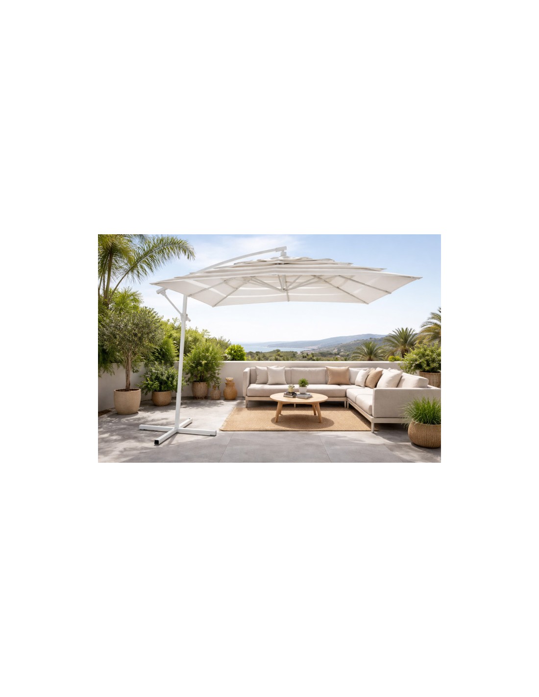 Con unas dimensiones de 250 cm de anchura y 250 cm de altura, el Parasol de Acero y Poliéster Blanco proporciona una cobertura amplia, ideal para proteger mesas de exterior, zonas de descanso o rincones chill out.