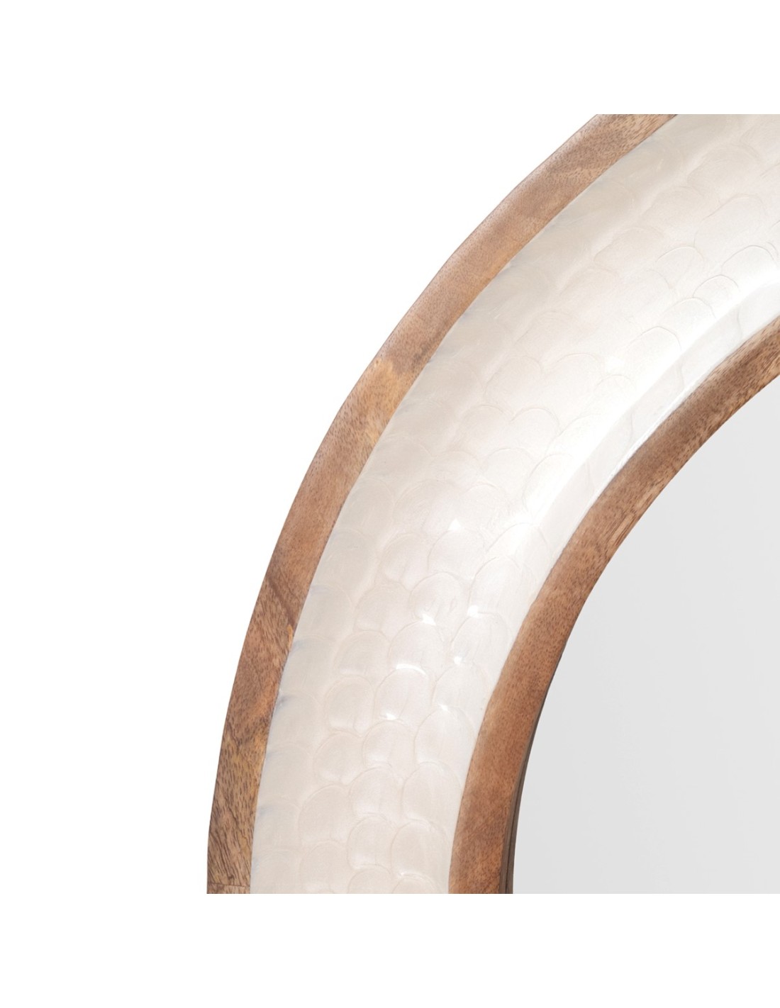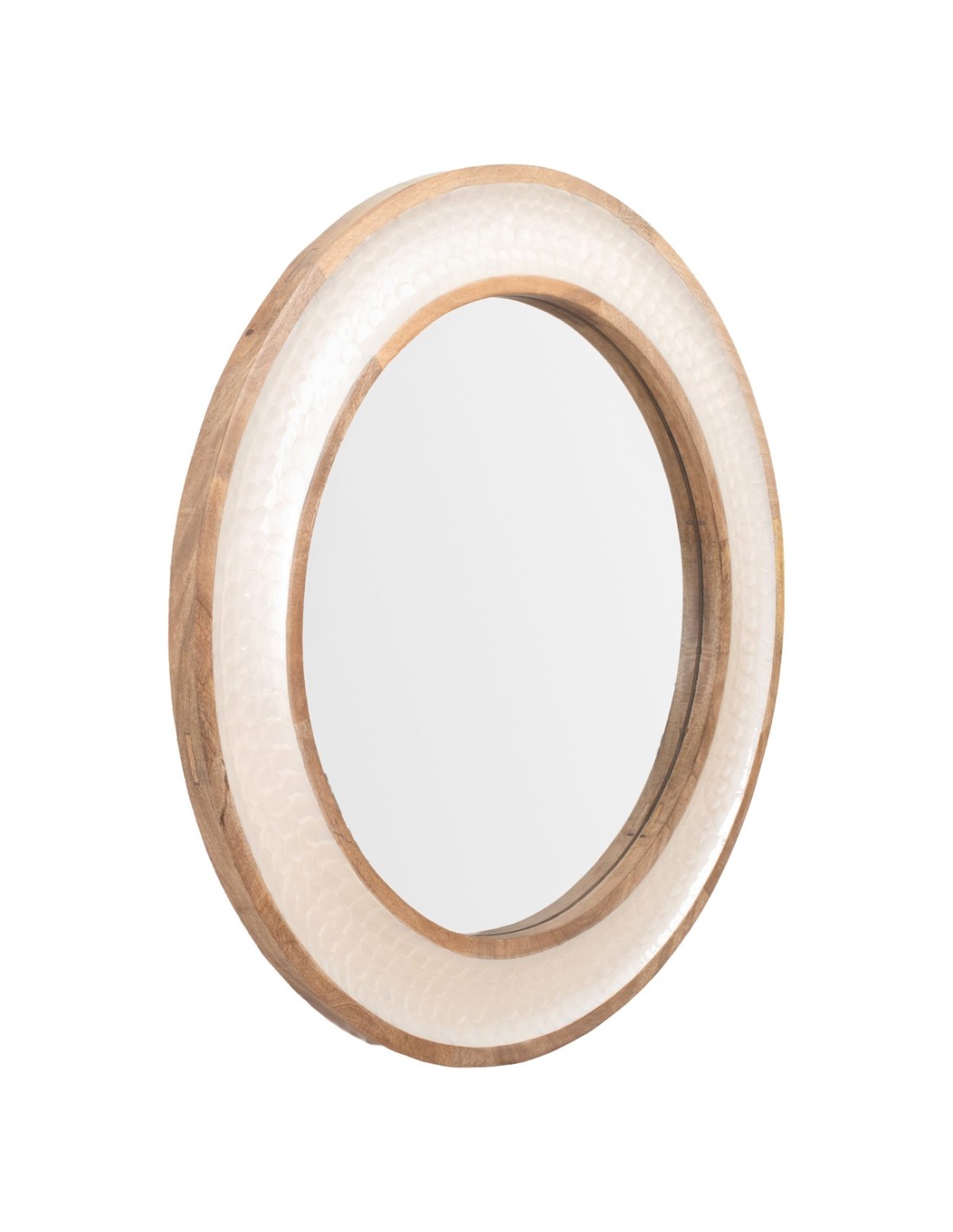 Este espejo está fabricado en madera con un elegante diseño de nácar en formato redondo, creando una estética delicada y moderna. Su forma circular aporta fluidez visual, convirtiéndolo en una opción ideal para decorar cualquier estancia con estilo.