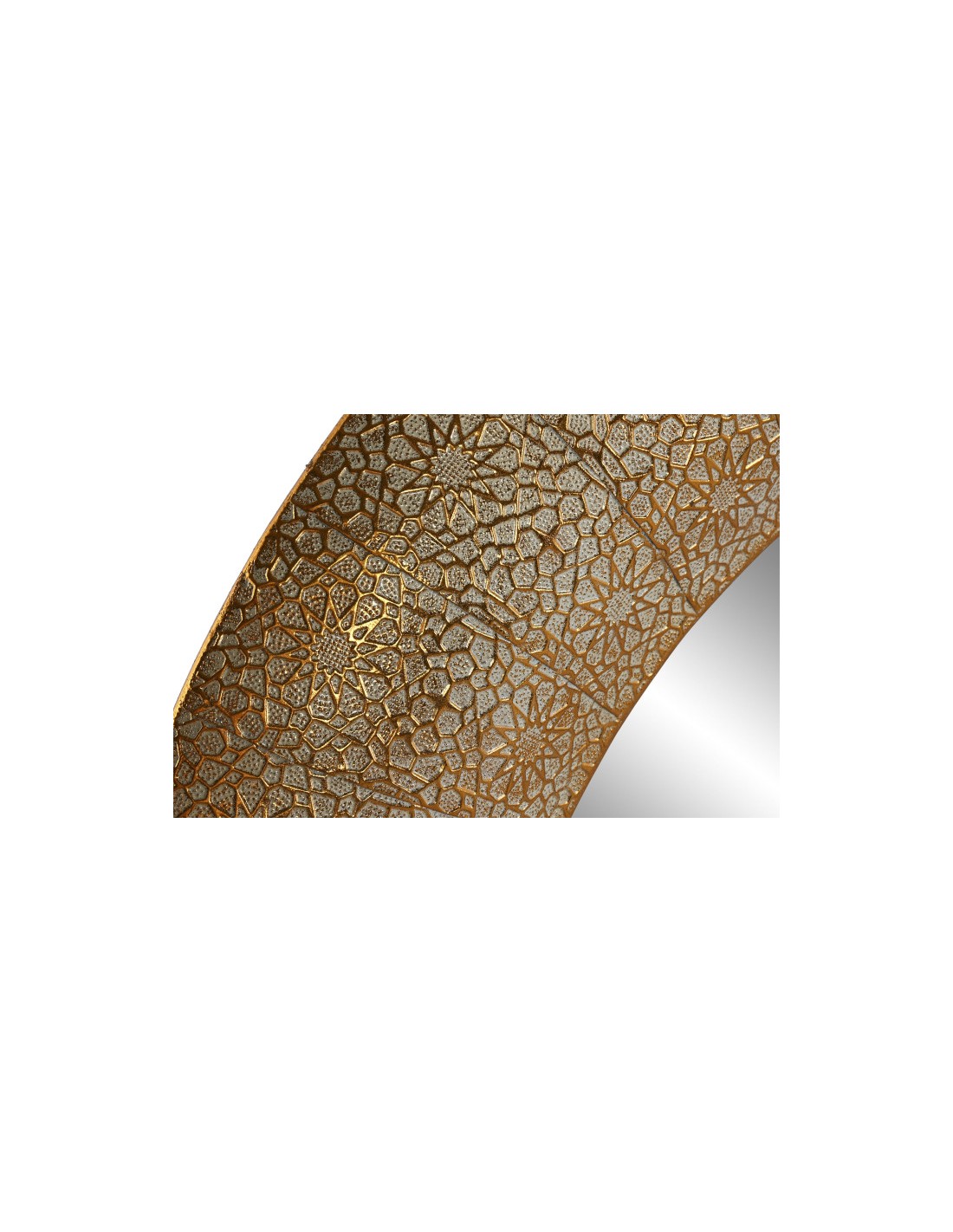 El acabado en color dorado junto con los adornos en relieve aporta un toque decorativo elegante y atemporal, perfecto para reflejar la luz natural o artificial y dar mayor luminosidad a la estancia. Este espejo puede colocarse solo como pieza central o combinado con otros elementos decorativos para crear composiciones de pared con estilo.