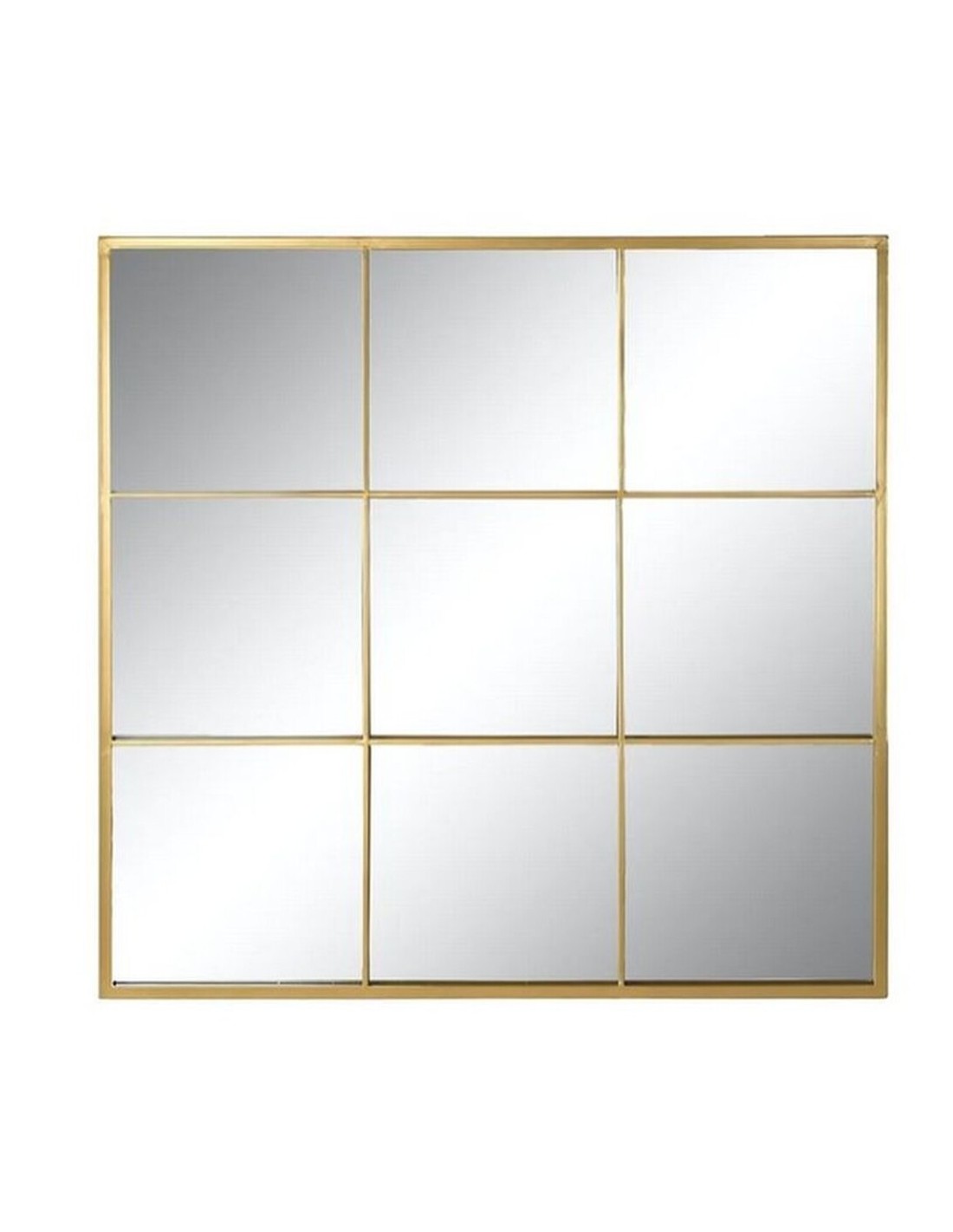 Este espejo está fabricado en metal y pintado en color dorado, lo que le aporta un acabado elegante y moderno. Su diseño de cuadros imita la forma de una ventana, creando un efecto visual único que transforma cualquier pared en un elemento decorativo protagonista.