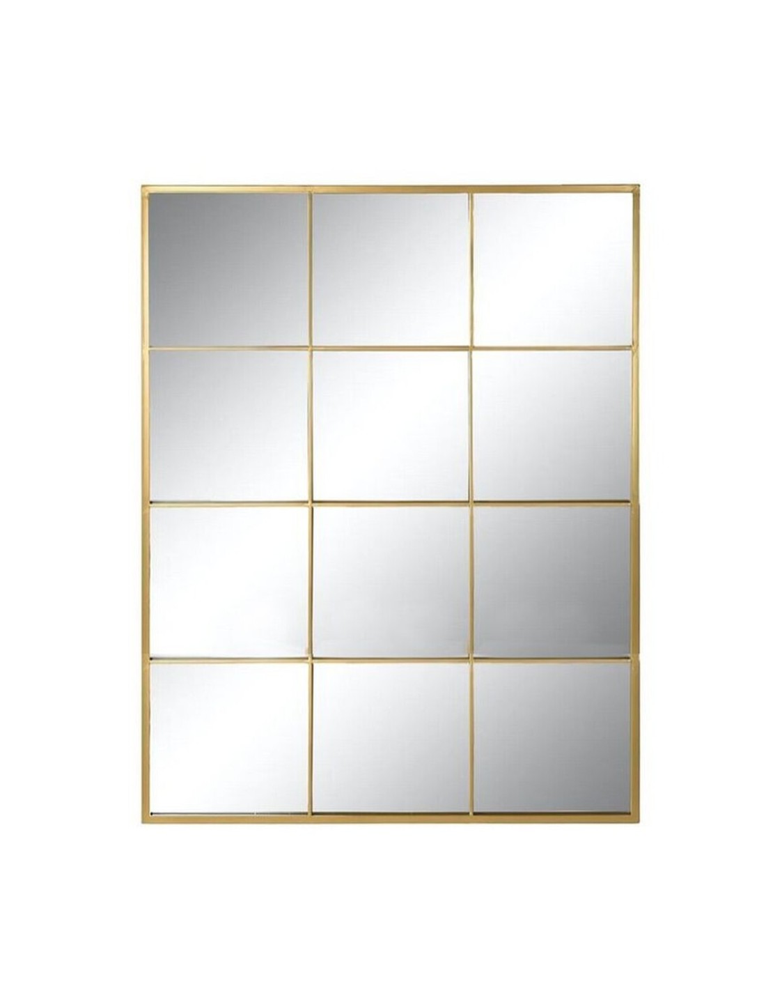 Este espejo está fabricado en metal y pintado en color dorado, ofreciendo un acabado moderno y refinado. Su diseño de cuadros imita la estética de una ventana, aportando un toque arquitectónico que transforma cualquier pared en un punto focal.