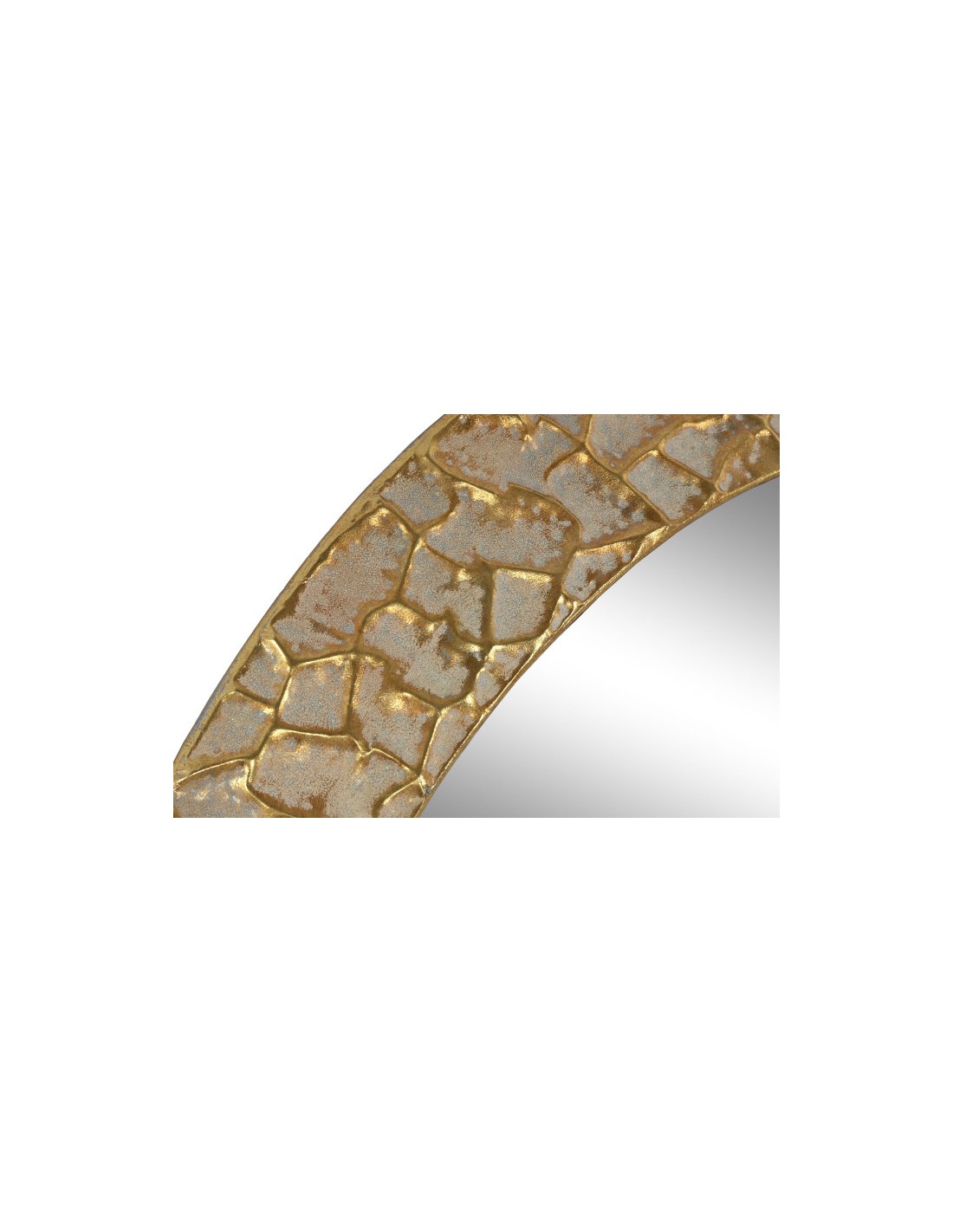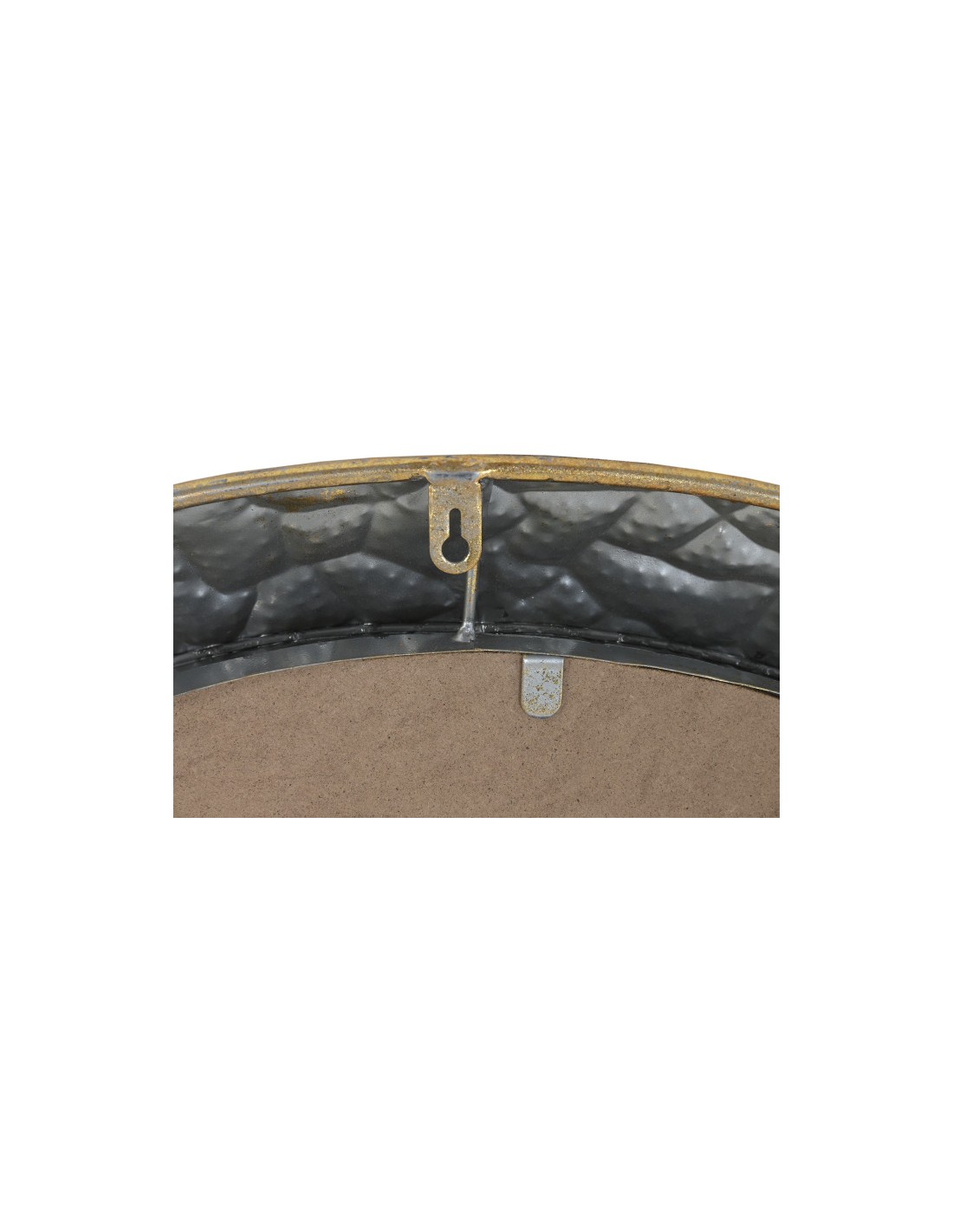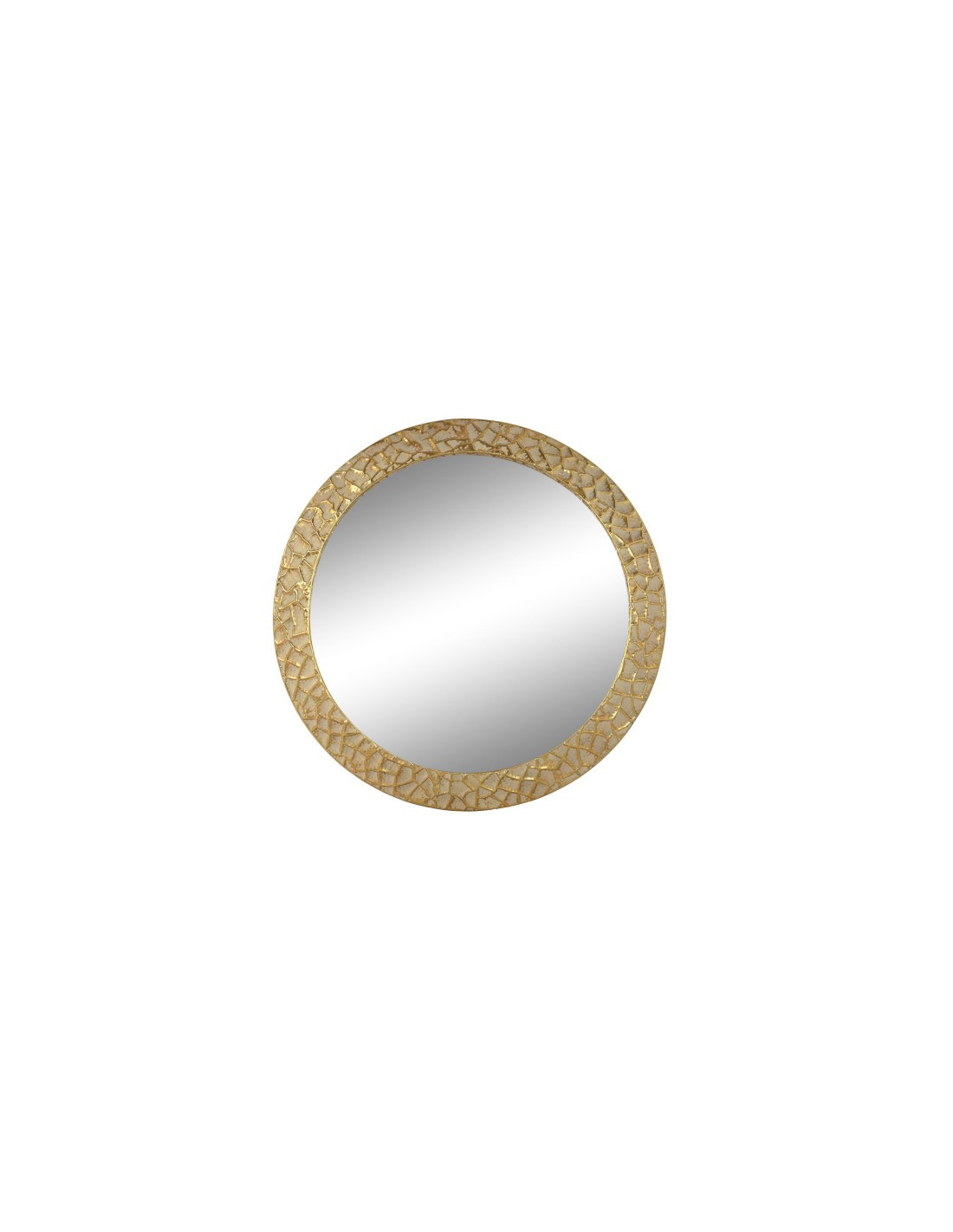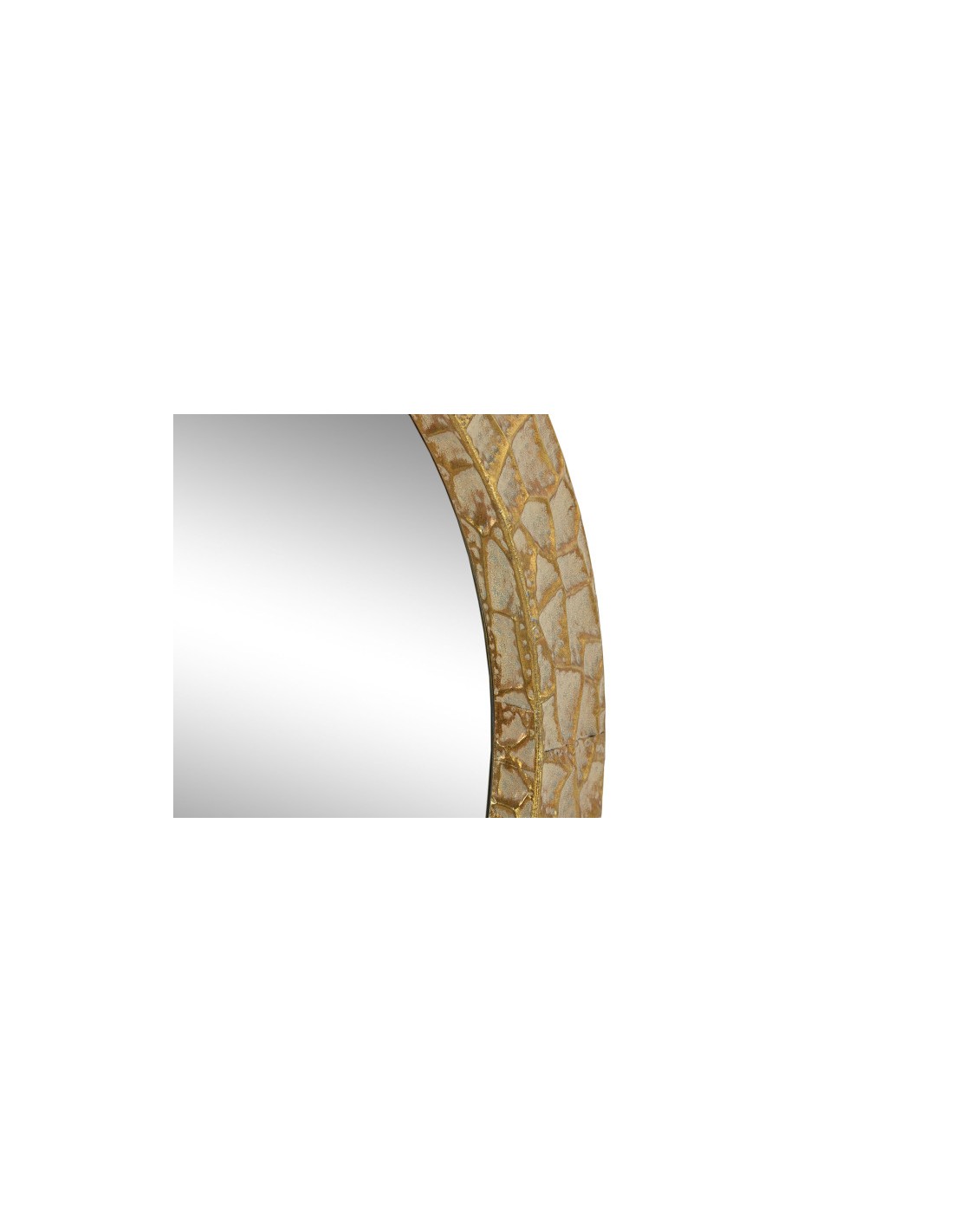 Espejo decorativo de metal dorado redondo con un perfil de diseño uniforme combinando el color dorado y el decapado blanco, ideal para colocar en una entrada o encima de un mueble en tu salón o dormitorio. medidas 78 cm de diámetro y 58,5 cm de grosor