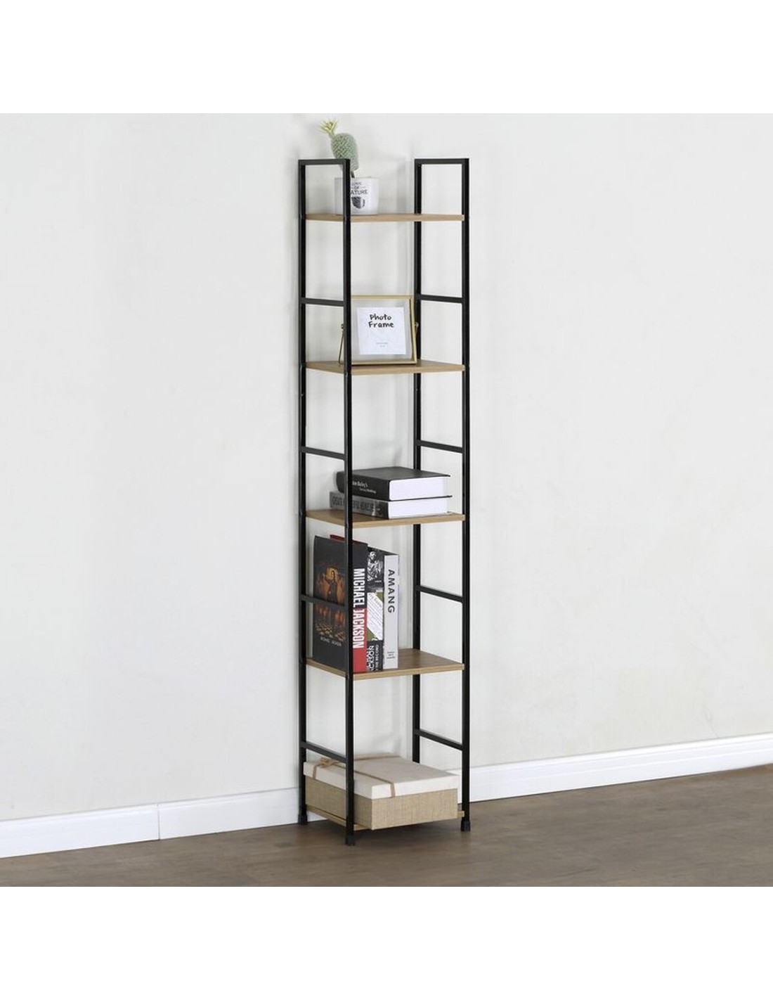 La Estantería de metal con cinco estantes destaca por su diseño vertical y estilizado, lo que la convierte en una opción perfecta para aprovechar al máximo el espacio disponible sin recargar visualmente la estancia.