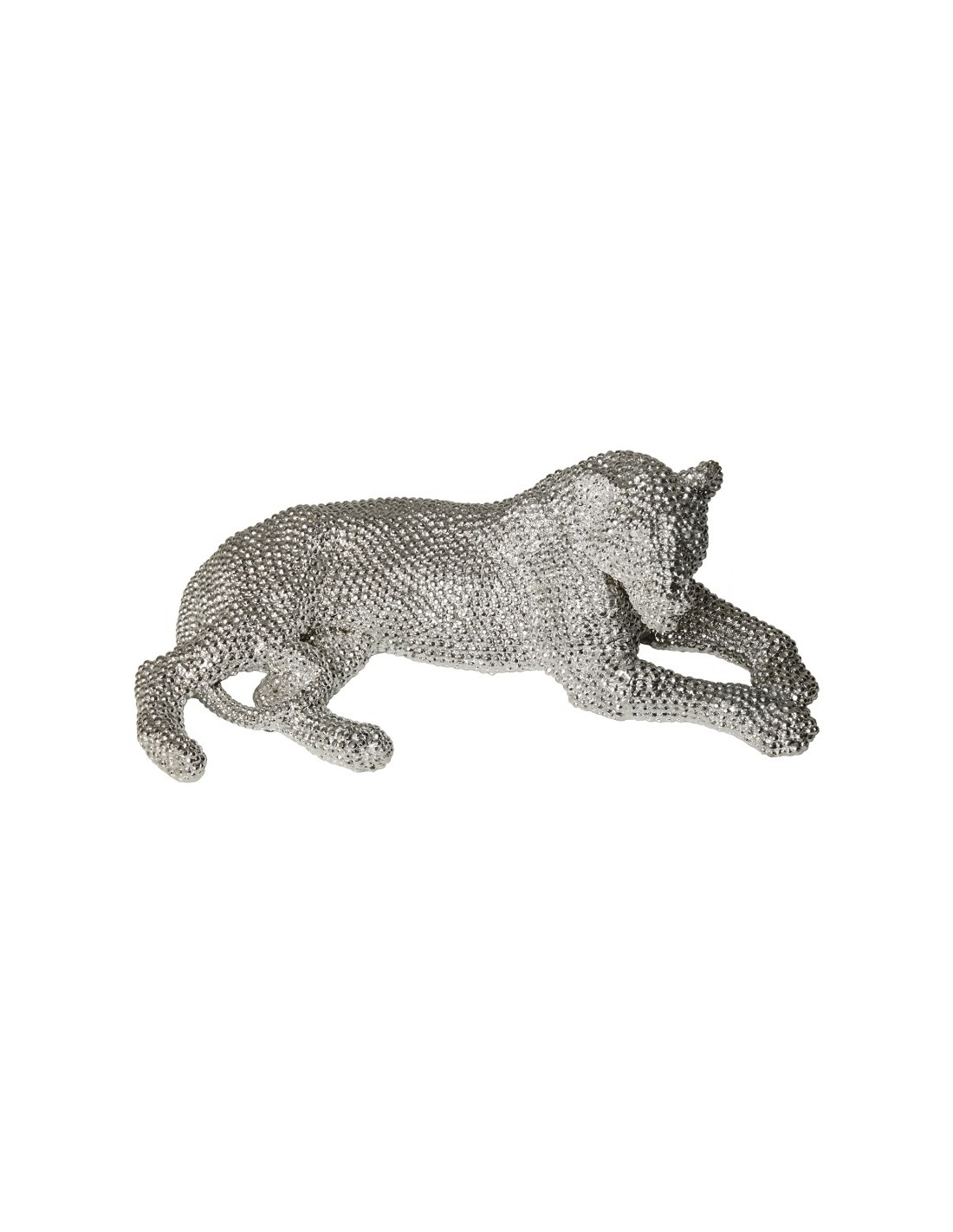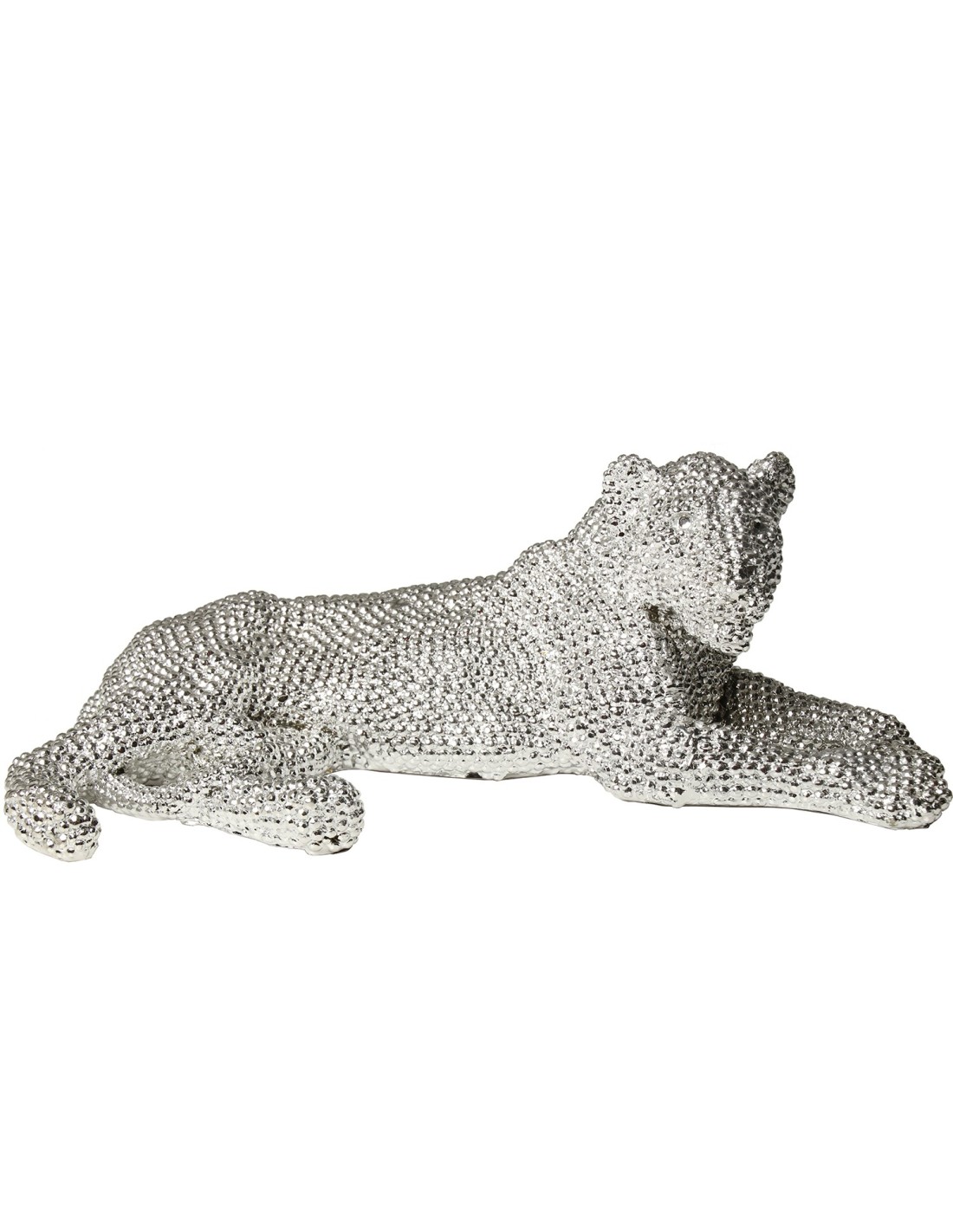 Fabricada en resina con acabado plateado y textura granulada, esta figura destaca por su brillo sutil y su estilo moderno. Su diseño la convierte en un elemento decorativo llamativo sin resultar excesivo.