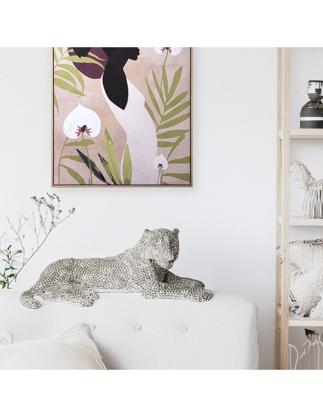 Los elementos decorativos aportan personalidad al espacio. La Figura de Resina Leona destaca por su diseño y presencia.