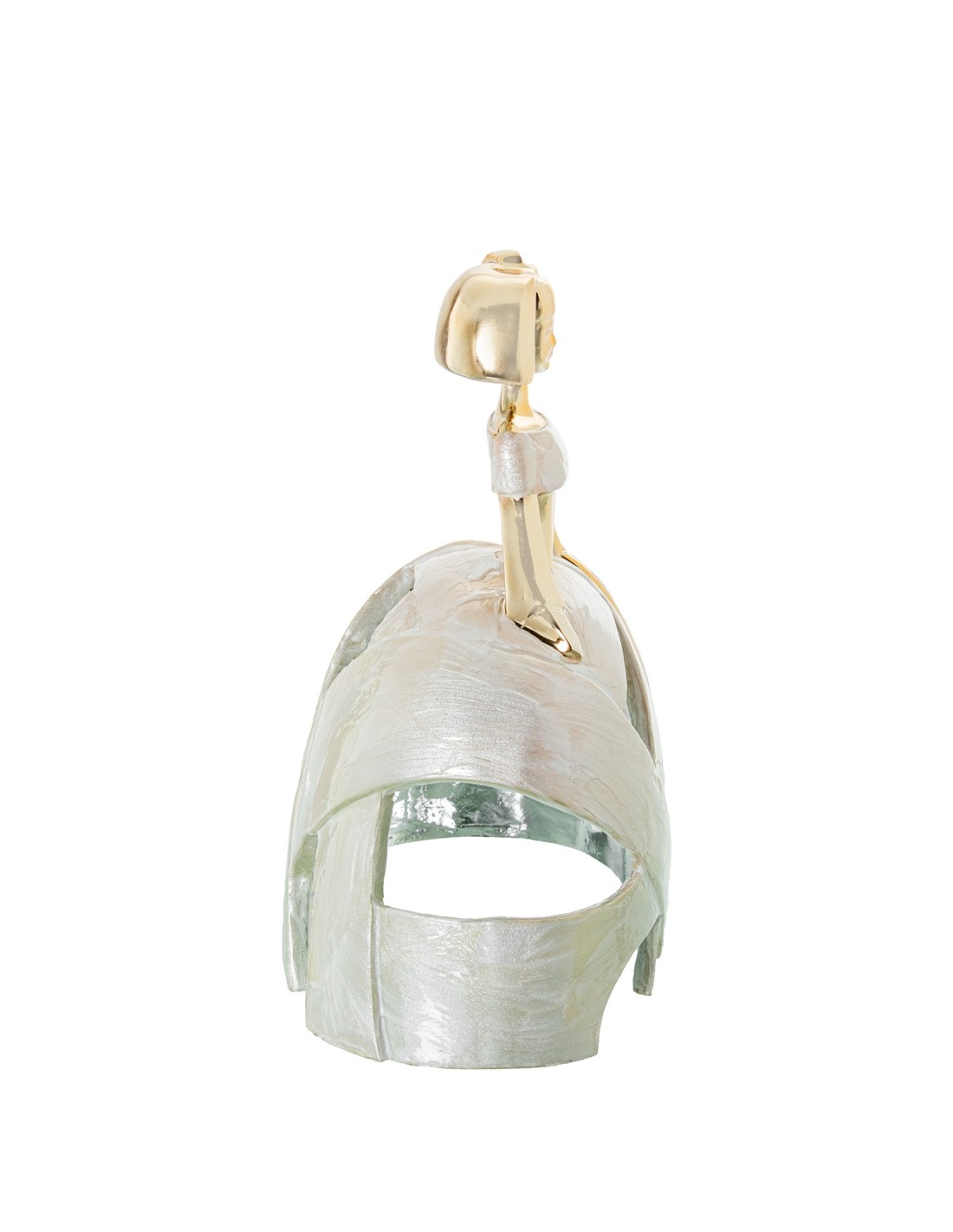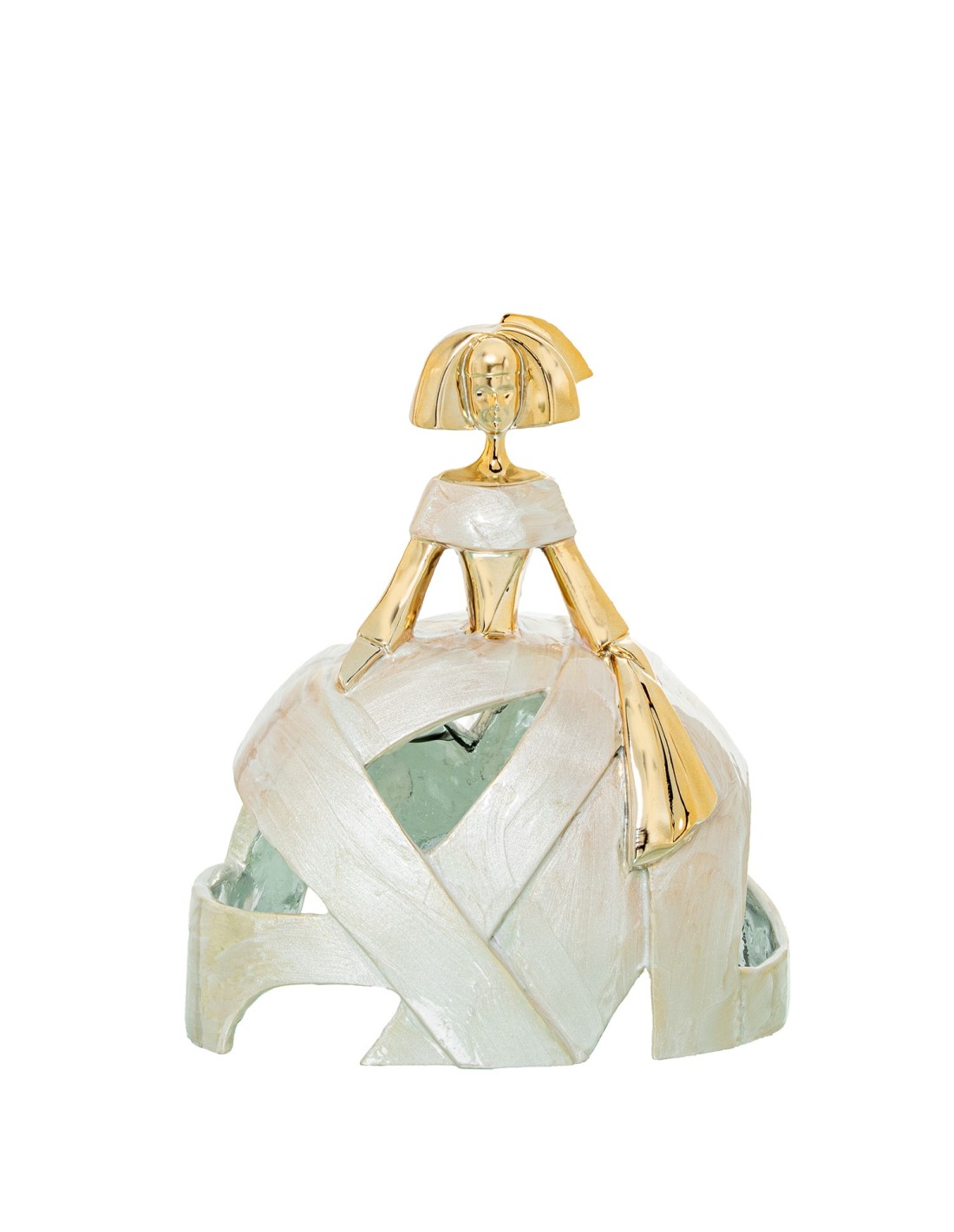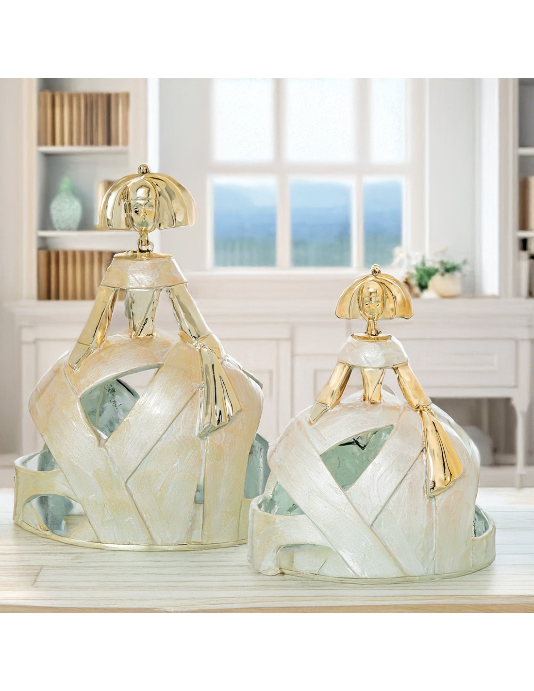 Esta preciosa figura representa una Menina con un acabado elegante y distinguido. Su vestido presenta un diseño calado en color blanco nácar, mientras que la parte superior y detalles del cuerpo están terminados en un tono dorado que aporta un efecto visual único.
