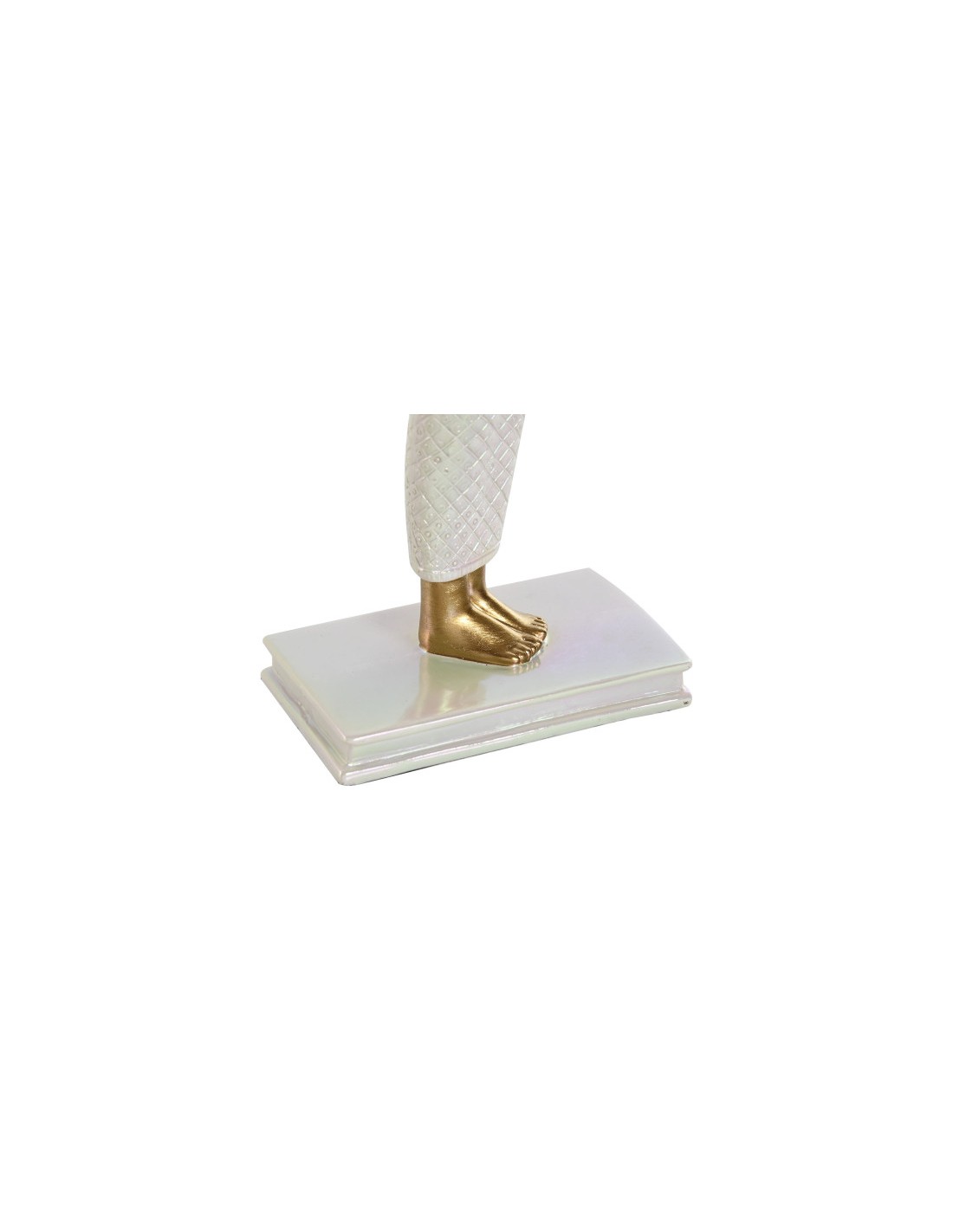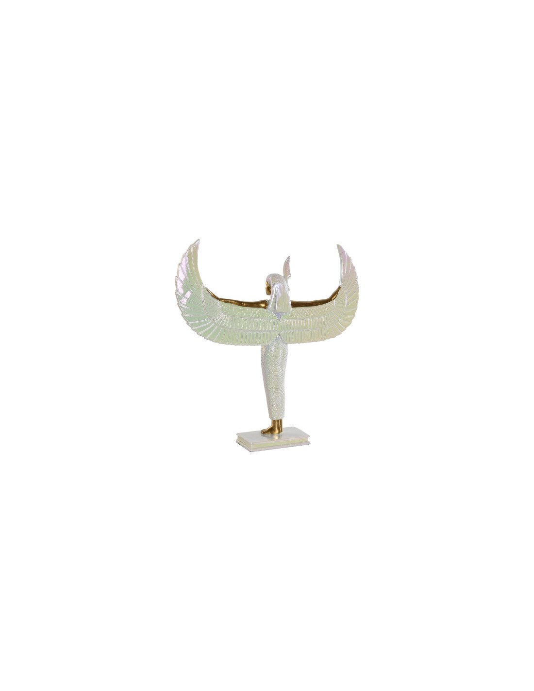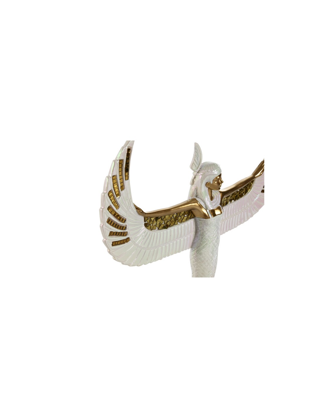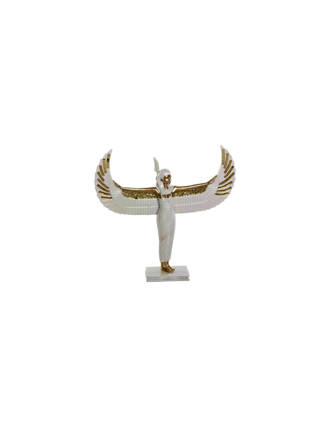Esta figura decorativa fabricada en resina representa a la diosa egipcia Isis, símbolo de protección, maternidad y sabiduría. Su acabado en color blanco con elegantes adornos en dorado aporta un estilo sofisticado y lleno de significado, ideal para decorar cualquier espacio del hogar.
