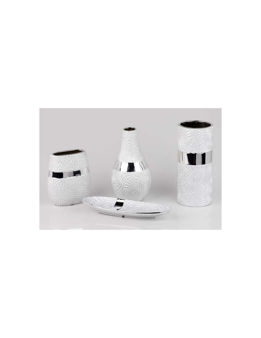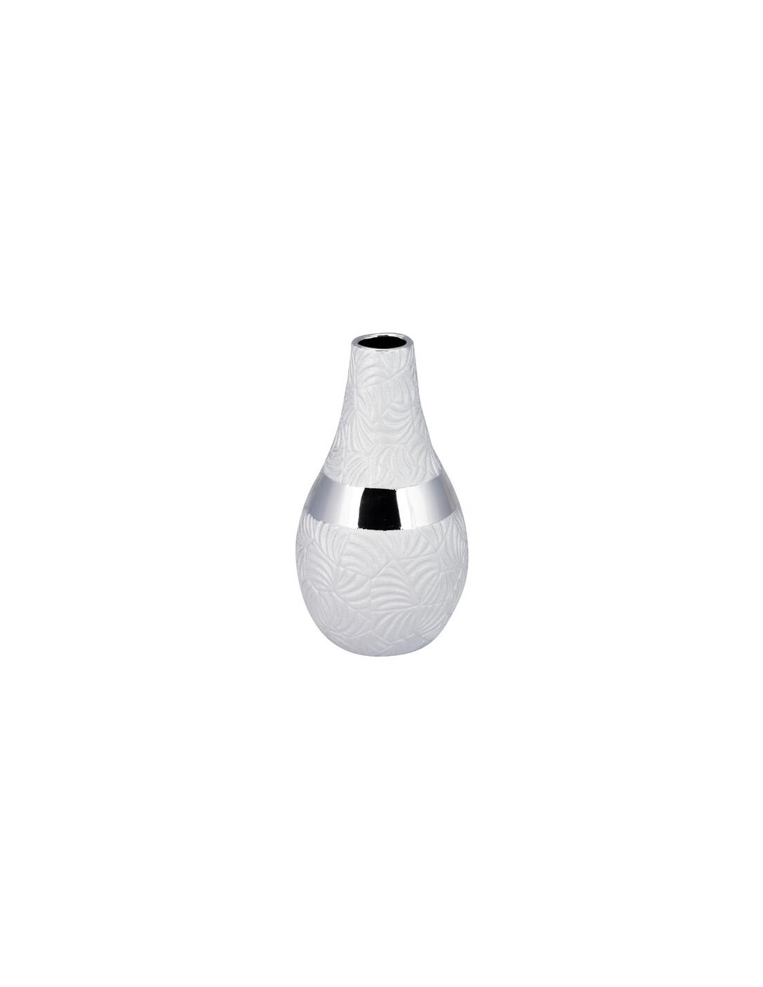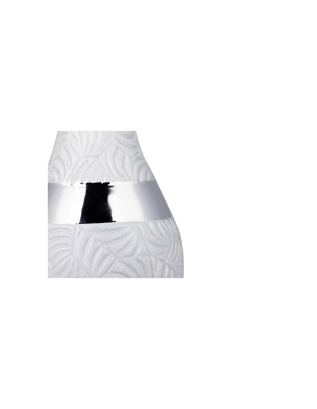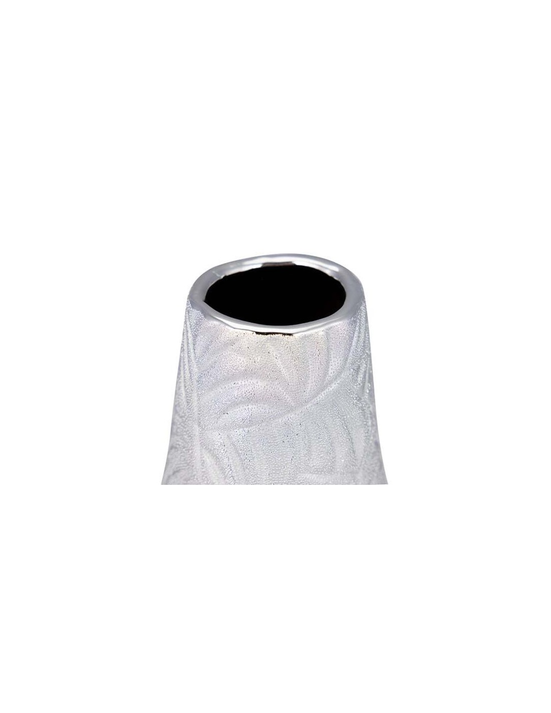 Este jarrón decorativo está fabricado en cerámica de alta calidad y se presenta en un elegante acabado plateado, combinando dos texturas que aportan un efecto visual muy sofisticado: el plata brillo y el plata mate. Esta mezcla de terminaciones hace que la pieza atrape la luz de manera especial, creando reflejos y contrastes muy decorativos que dan profundidad a cualquier ambiente. Con unas medidas de 15 cm de ancho y 28 cm de altura, es una pieza perfecta para colocar sobre aparadores, estanterías, consolas o mesas auxiliares, aportando un toque moderno sin recargar el espacio visual.