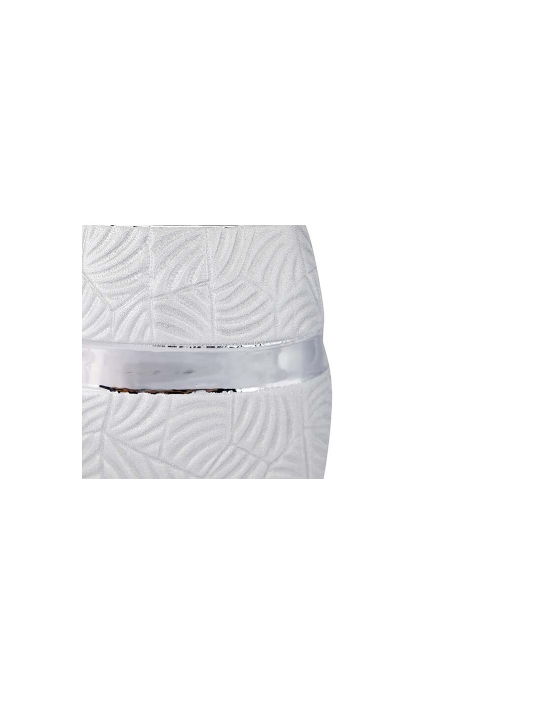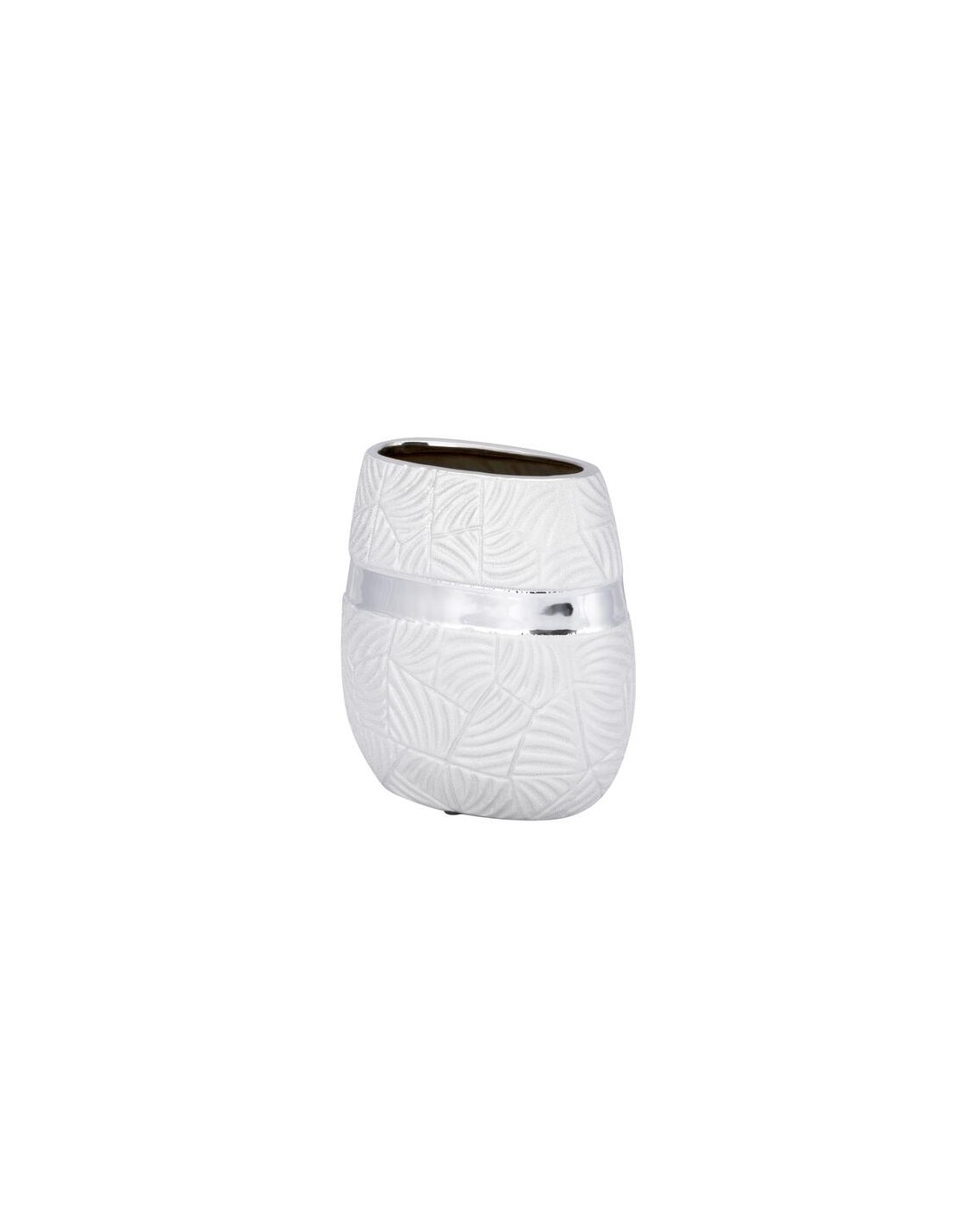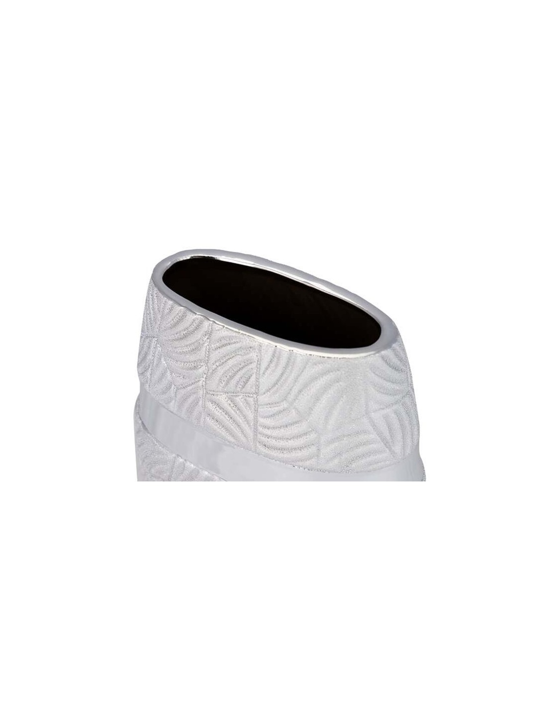 Jarrón decorativo fabricado en cerámica con un acabado en color plateado, combinando el plata brillo con el plata mate para conseguir un efecto visual único y elegante. Esta mezcla de terminaciones crea un contraste muy atractivo, aportando pequeños reflejos y puntos de luz que hacen que el jarrón llame la atención desde cualquier ángulo. Con unas medidas de 17 cm de ancho, 20 cm de altura y 10 cm de fondo, se trata de una pieza muy versátil y fácil de ubicar en infinidad de espacios dentro del hogar.