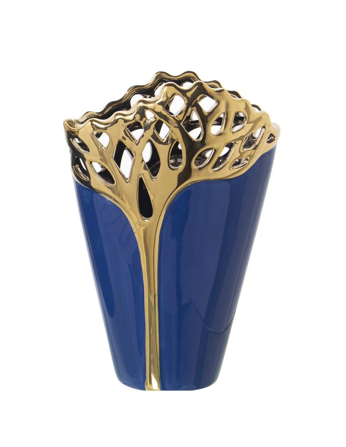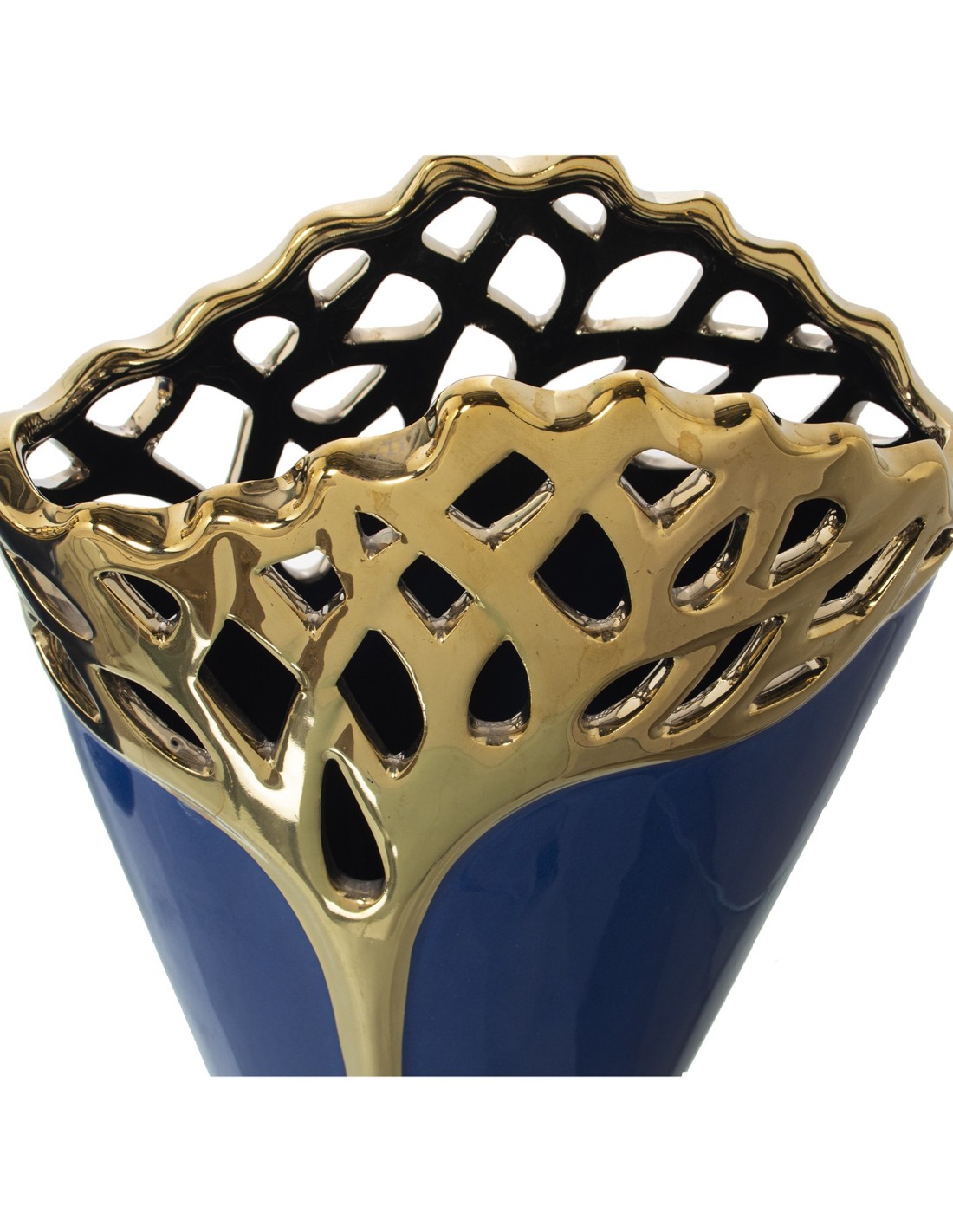 Jarrón de Cerámica Calado Azul y Dorado – Decoración Sofisticada con Jarrón de cerámica azul y dorado.