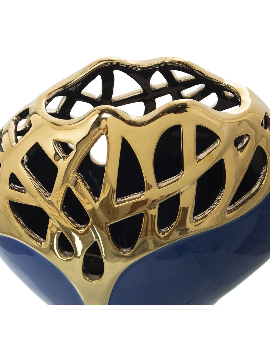 Una de las principales ventajas de este jarrón es su diseño calado, que lo convierte en una pieza diferente y con gran personalidad. No se trata de un simple accesorio, sino de un elemento que realza la decoración con un aire artístico y exclusivo. La combinación del azul con el dorado transmite elegancia, serenidad y lujo, creando una pieza muy atractiva a nivel visual.