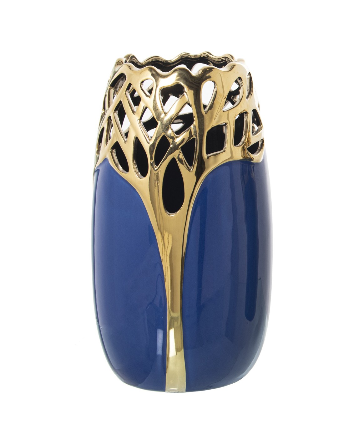 Jarrón de cerámica calado azul y dorado alto para una decoración elegante y actual