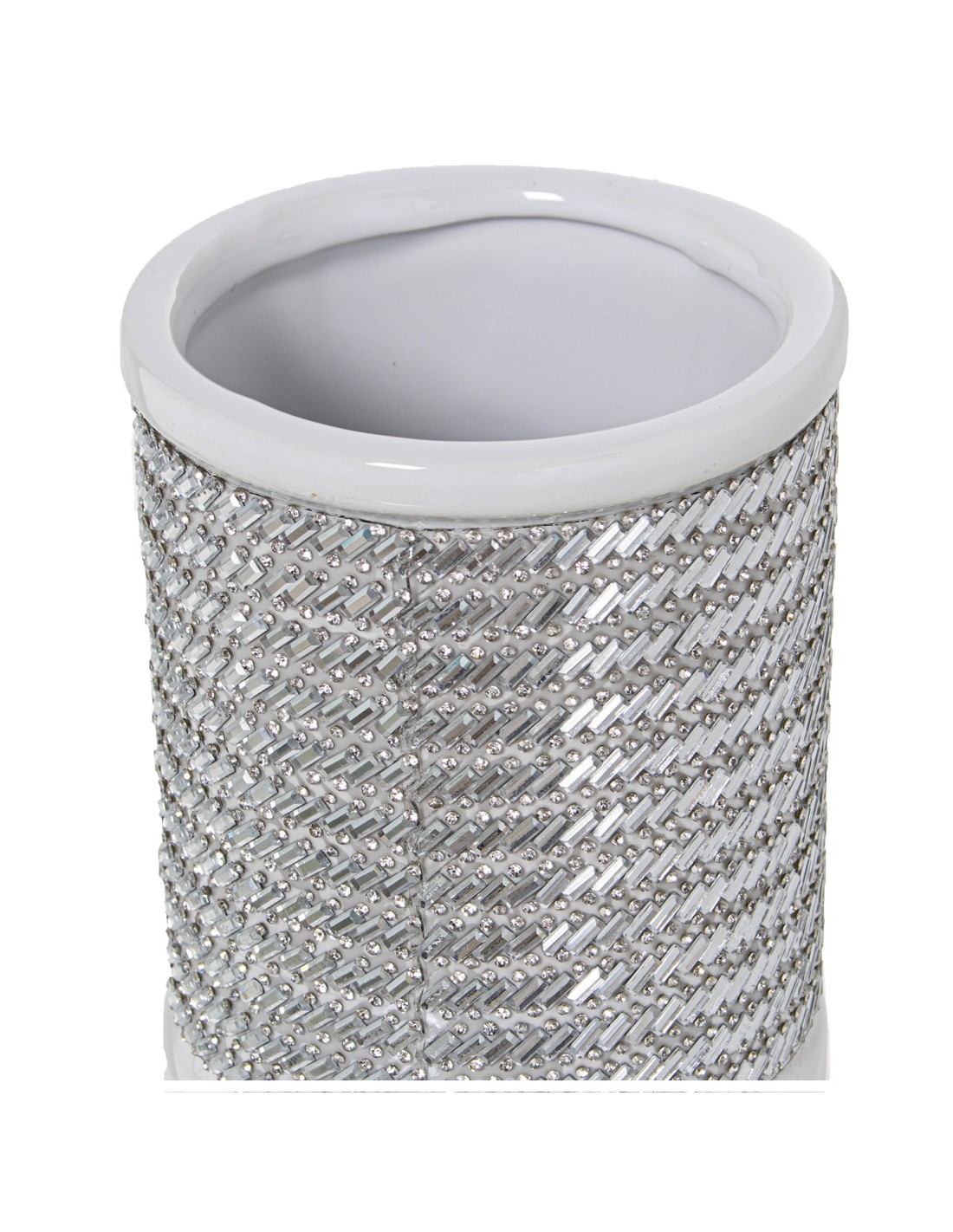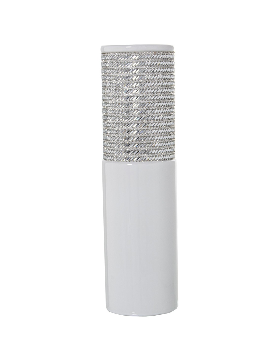 Jarrón de cerámica en blanco y plata con decoración en brillo para una decoración elegante y luminosa