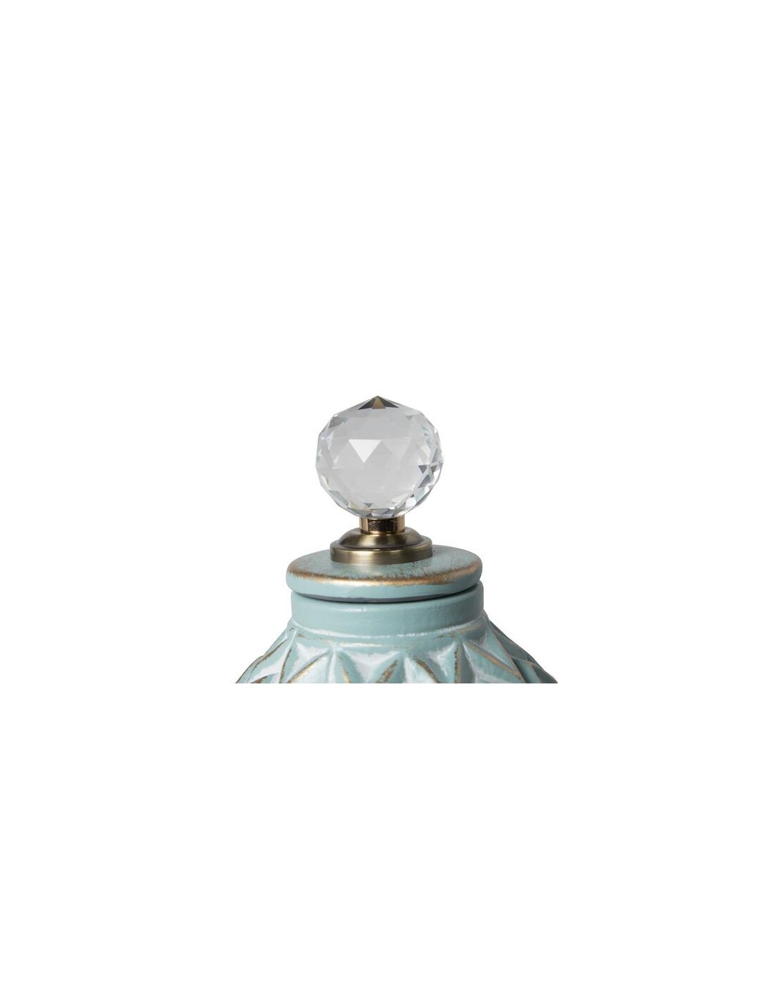 Este elegante jarrón decorativo con diseño tipo tibor está fabricado en cerámica de alta calidad, pintado en color verde y decorado con refinados adornos en dorado. Su tapa con terminación en cristal aporta un acabado sofisticado y distinguido, ideal para realzar cualquier espacio del hogar.