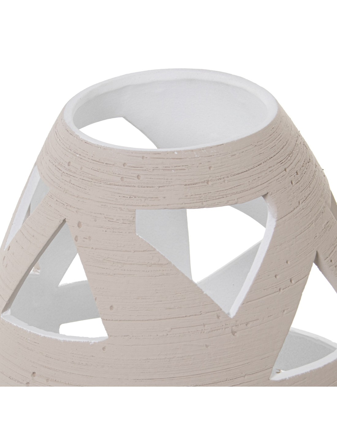 Este jarrón de cerámica en color crudo con diseño rayado y detalles calados con agujeros es una pieza decorativa perfecta para aportar textura, luz y estilo a cualquier espacio del hogar. Su acabado natural transmite calidez y armonía, adaptándose fácilmente a diferentes estilos decorativos.