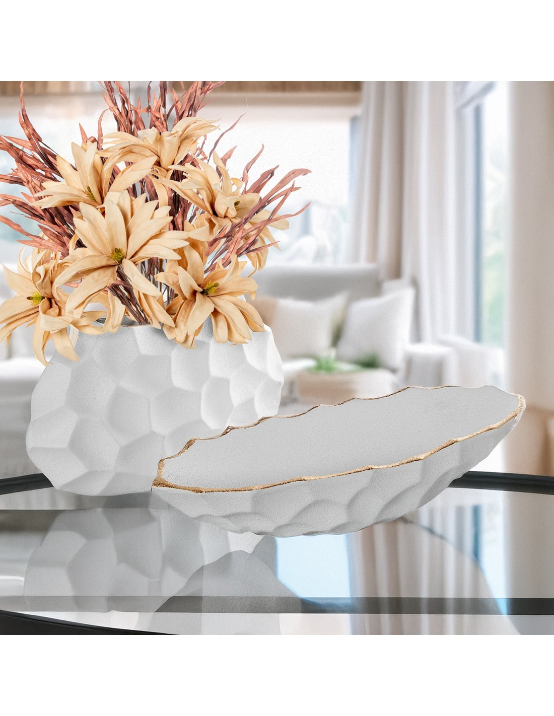 Una de las principales ventajas de este centro de mesa es su combinación de color blanco arena con detalles dorados, que aporta luminosidad y un toque sofisticado a cualquier espacio. Este contraste crea una decoración equilibrada y elegante que se adapta fácilmente a diferentes estilos.