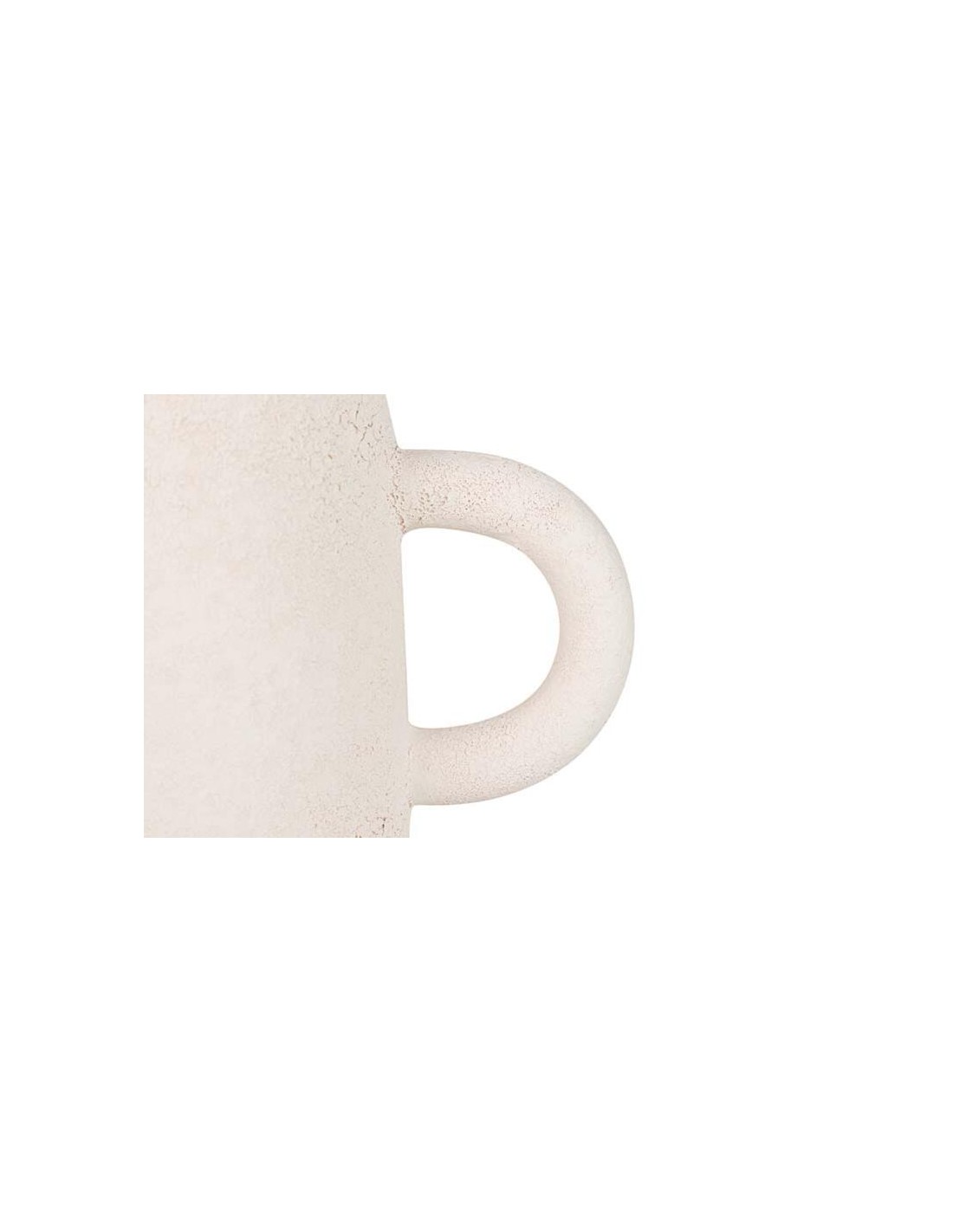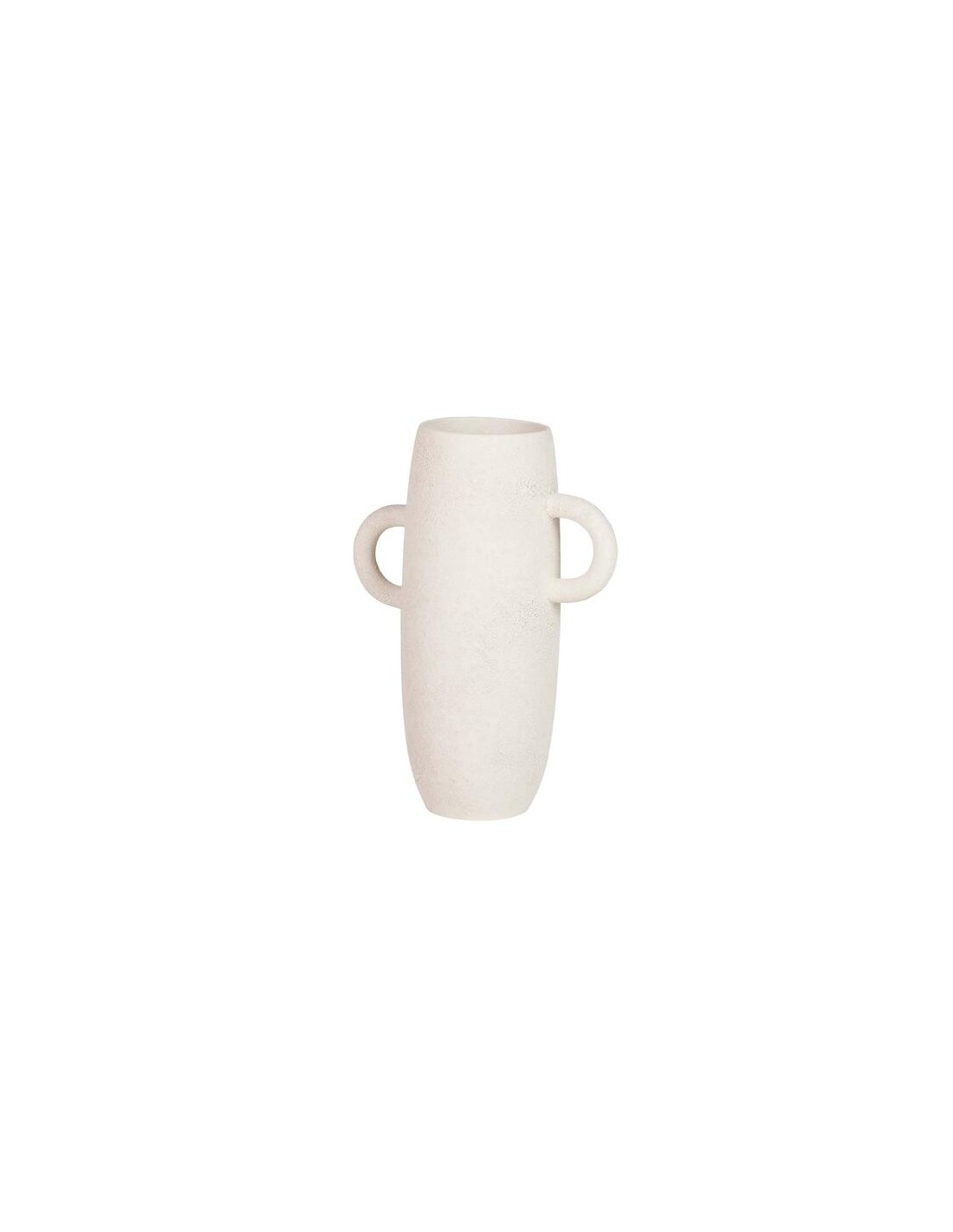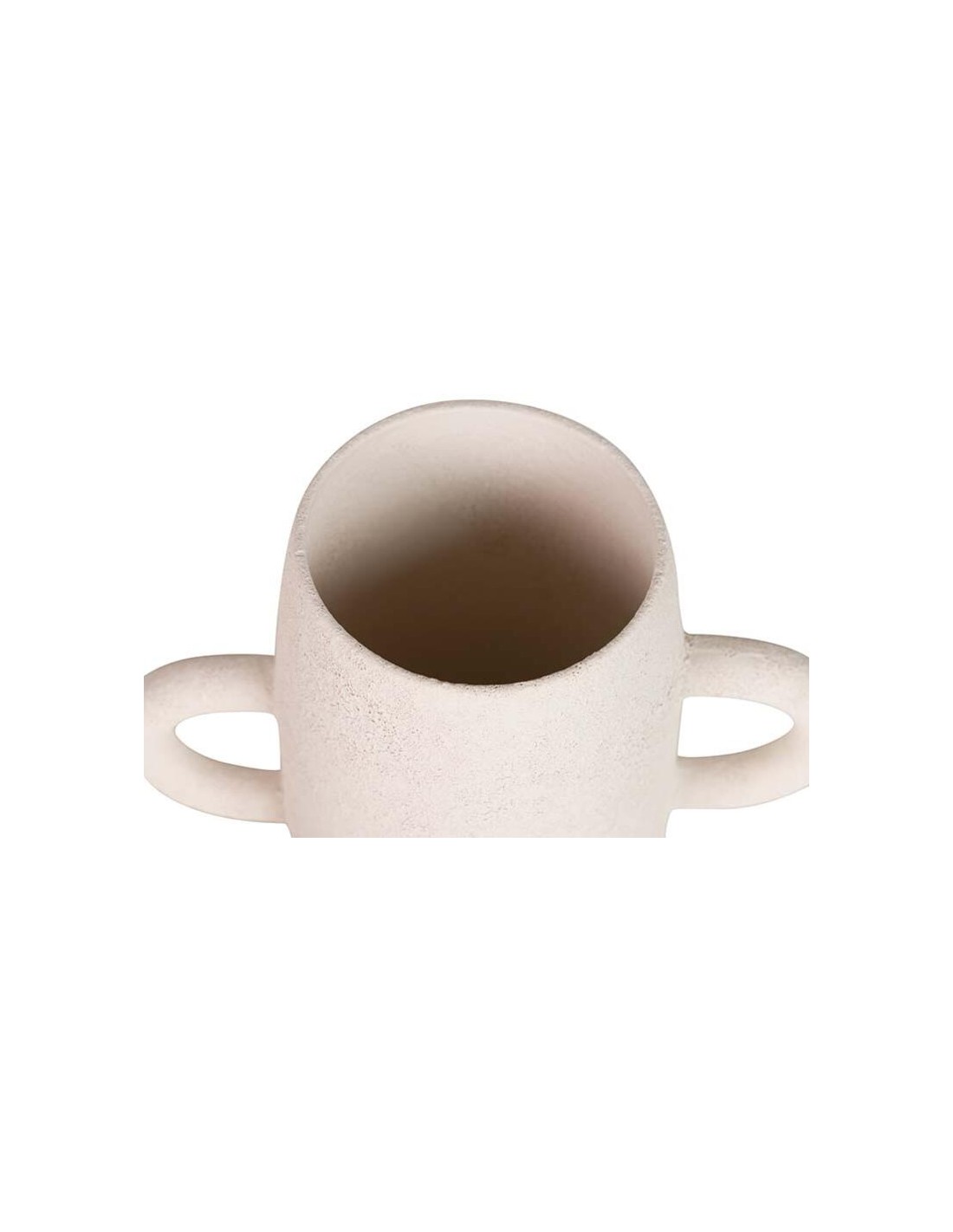 Este jarrón está fabricado en cerámica y presenta un acabado en color beige, un tono neutro que transmite calma y combina fácilmente con diferentes estilos decorativos. Su diseño alargado, junto con sus dos asas laterales, aporta un toque distintivo que lo convierte en una pieza decorativa muy especial.