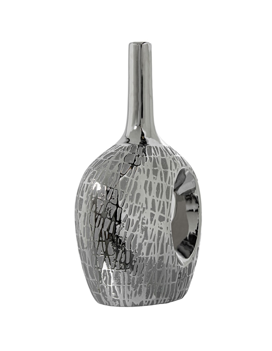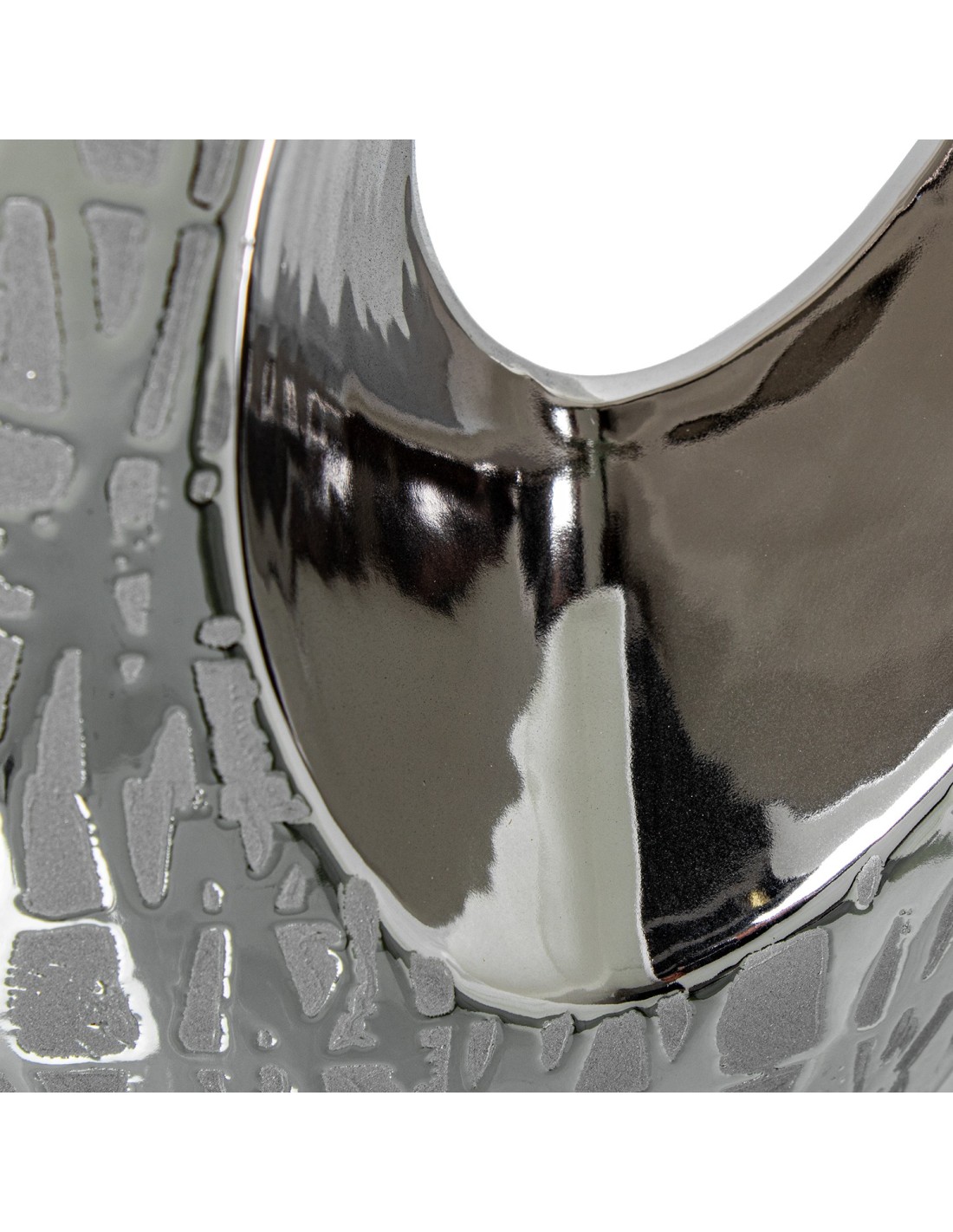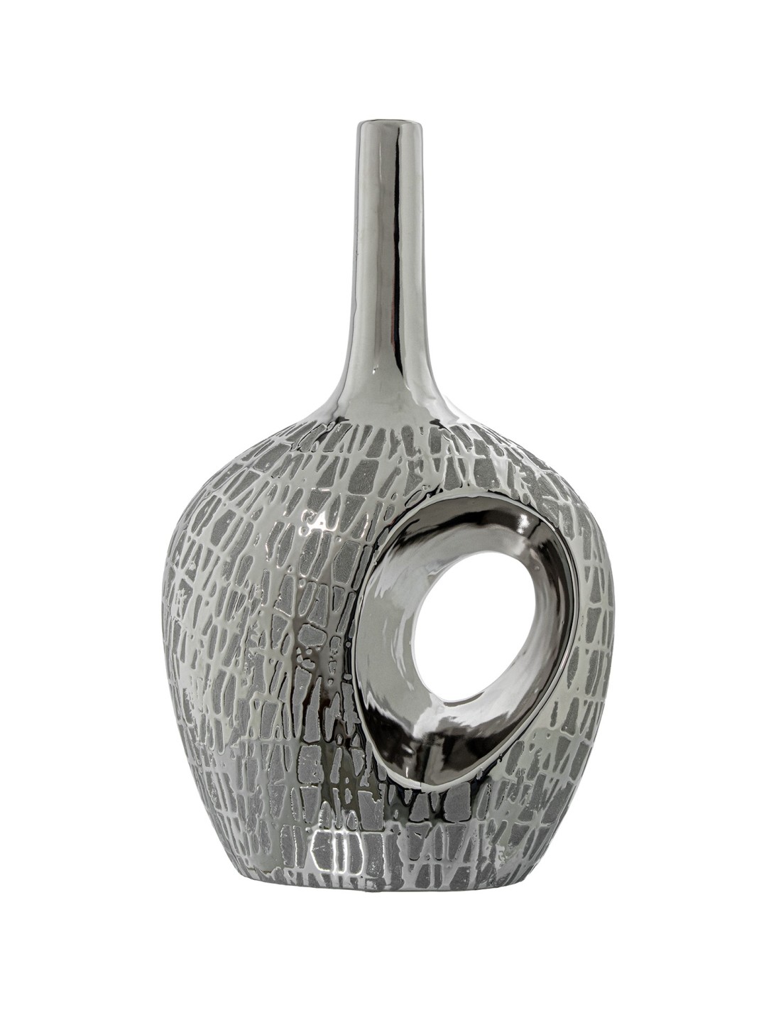 Este jarrón está fabricado en cerámica con un acabado en color plateado que mezcla texturas mate y brillo, creando un contraste visual atractivo. Su diseño con agujero central y boca estrecha aporta un estilo vanguardista que encaja perfectamente en ambientes modernos, minimalistas o incluso industriales.