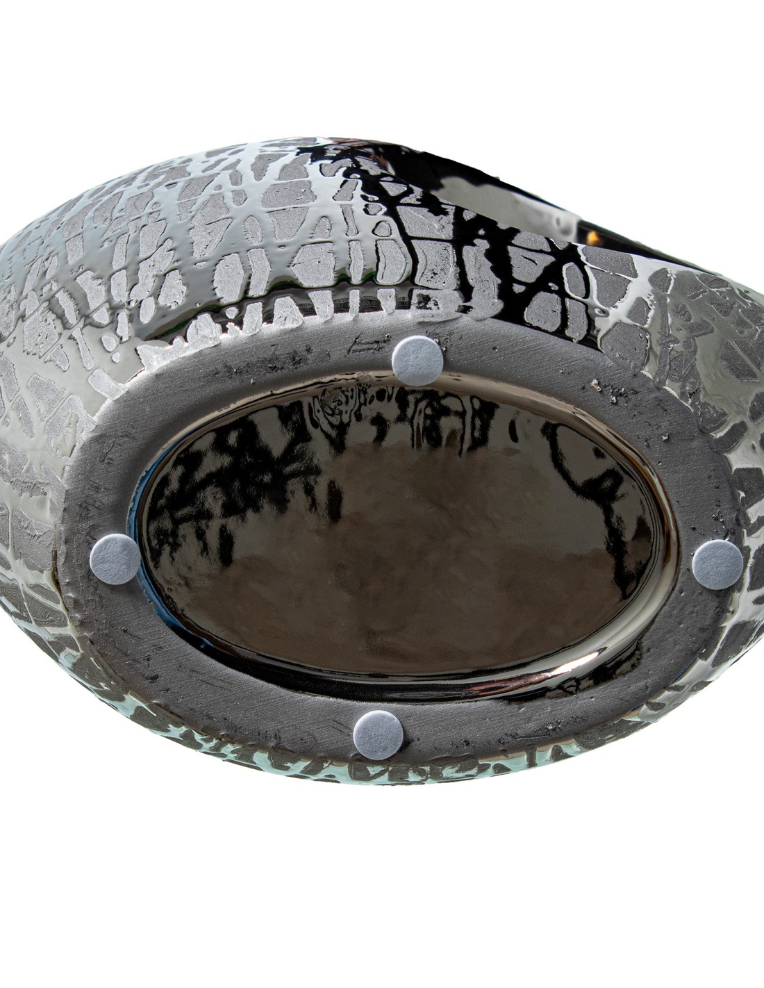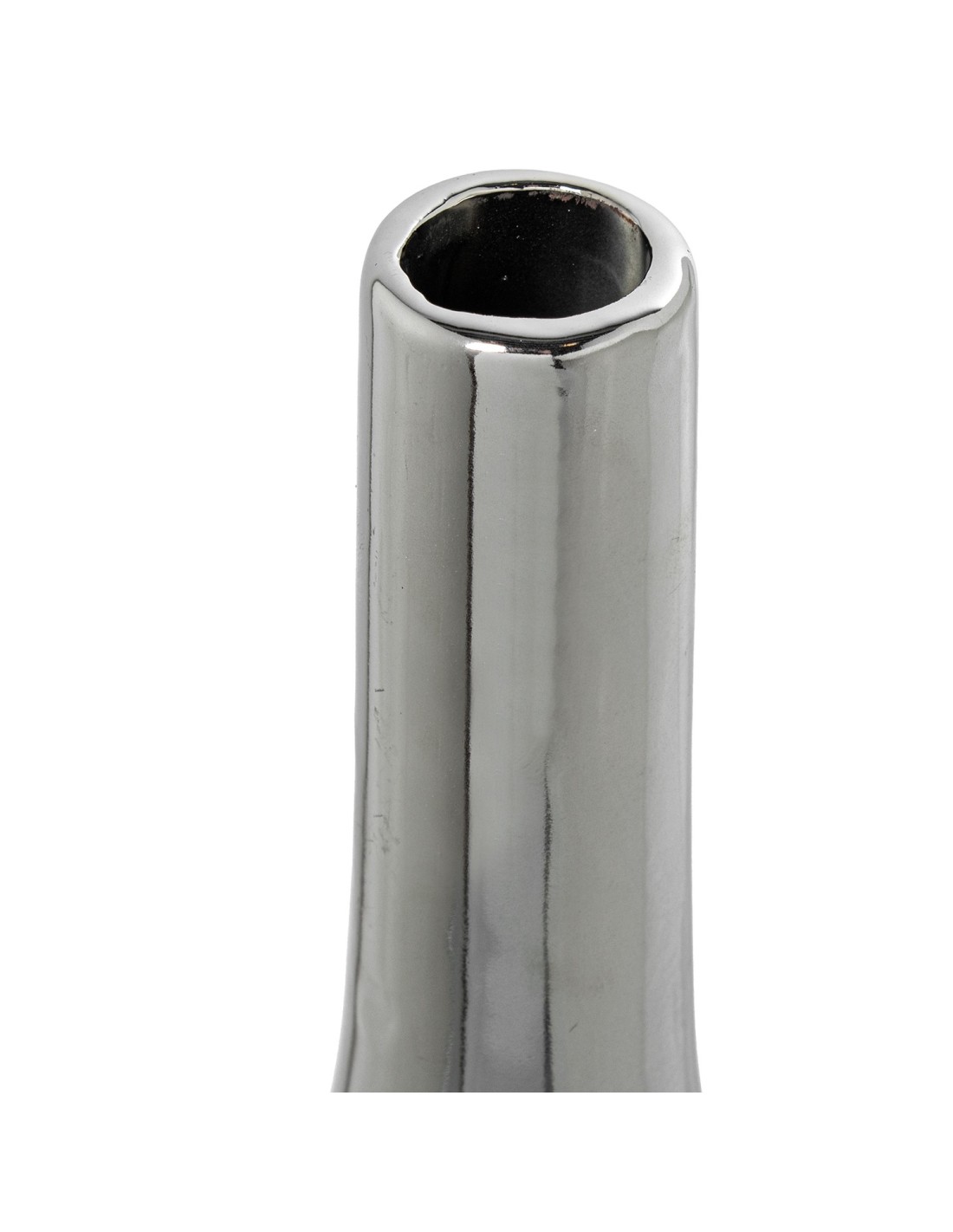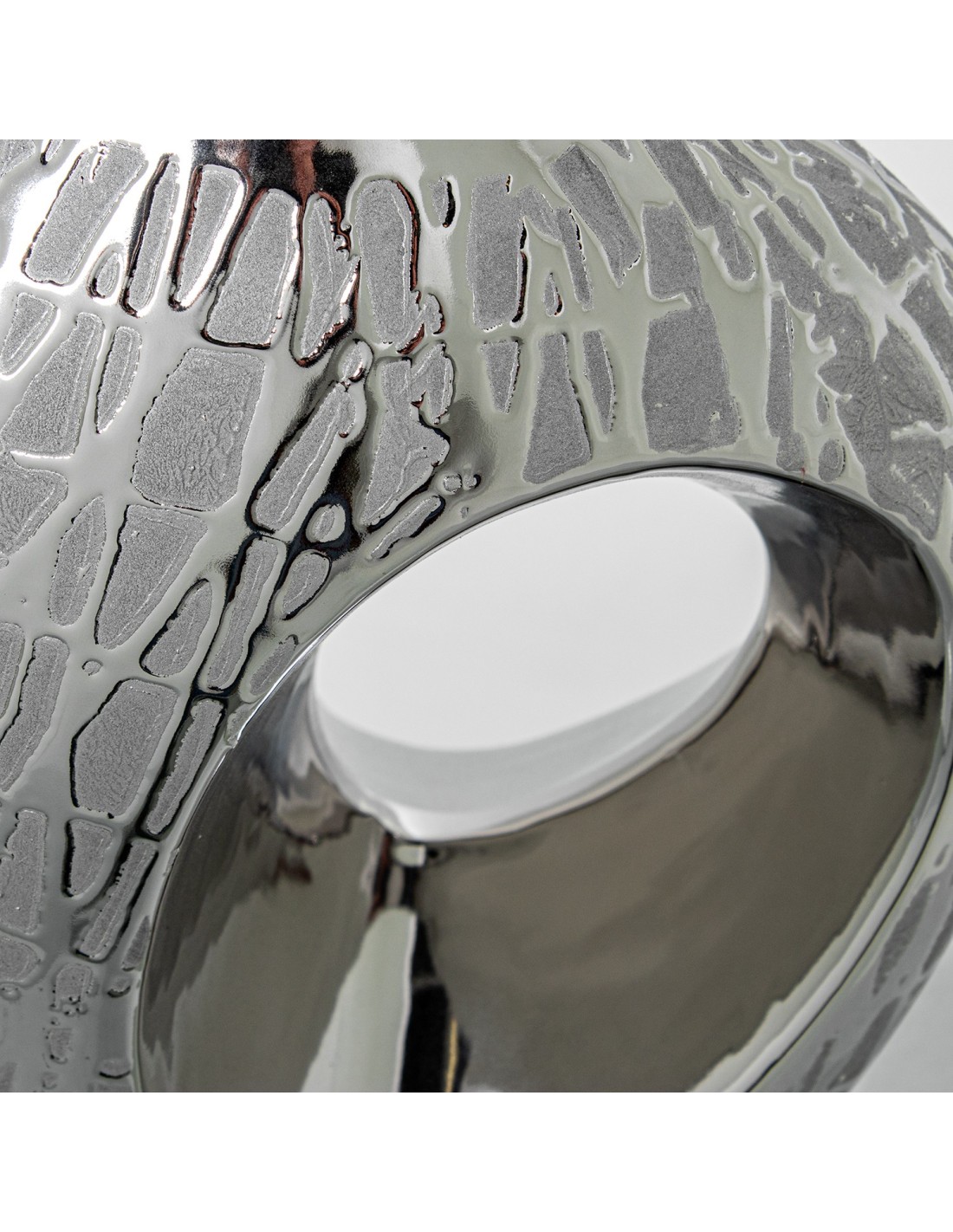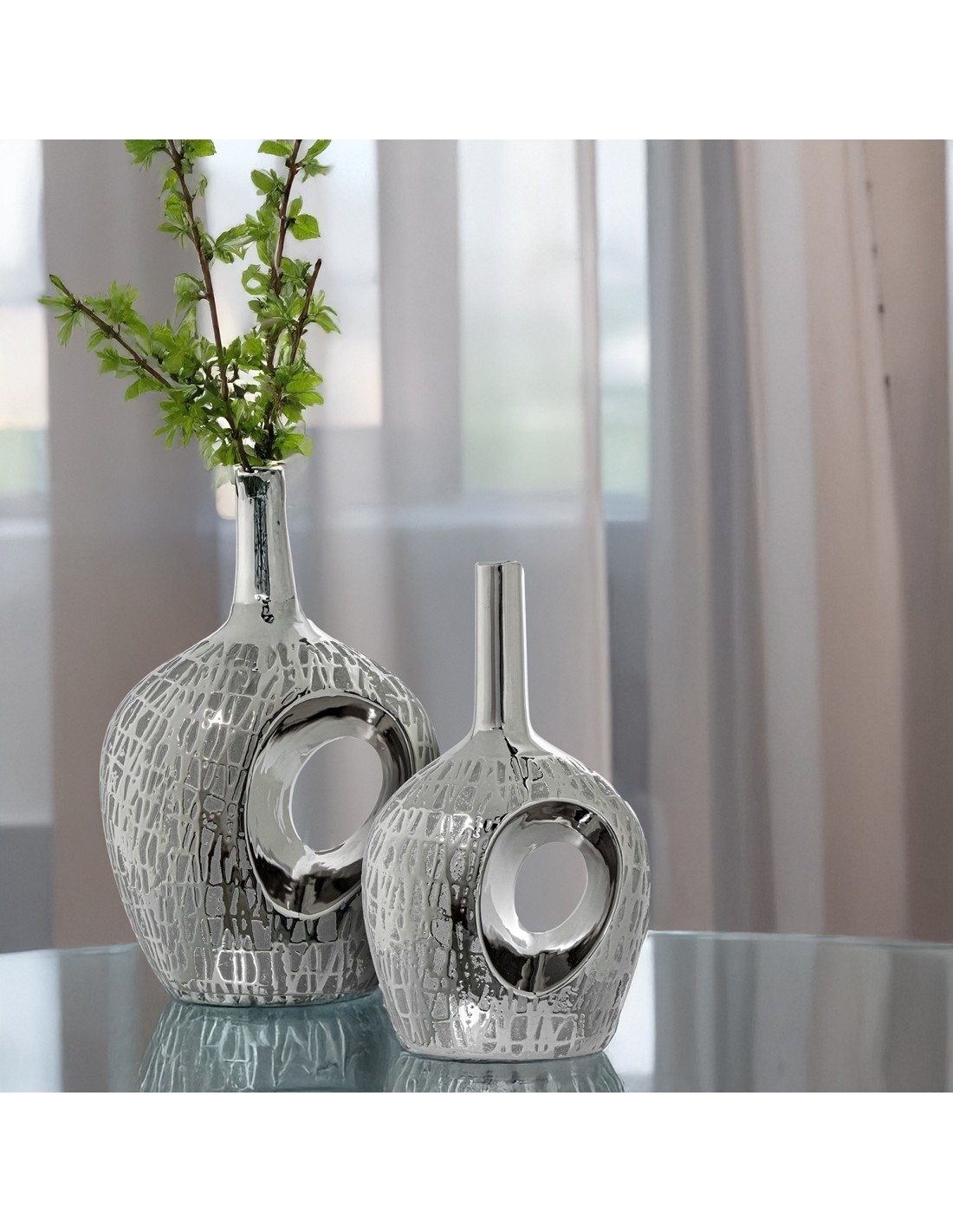 Este jarrón está fabricado en cerámica con un acabado en color plateado que mezcla texturas mate y brillo, creando un contraste visual atractivo. Su diseño con agujero central y boca estrecha aporta un estilo vanguardista que encaja perfectamente en ambientes modernos, minimalistas o incluso industriales.