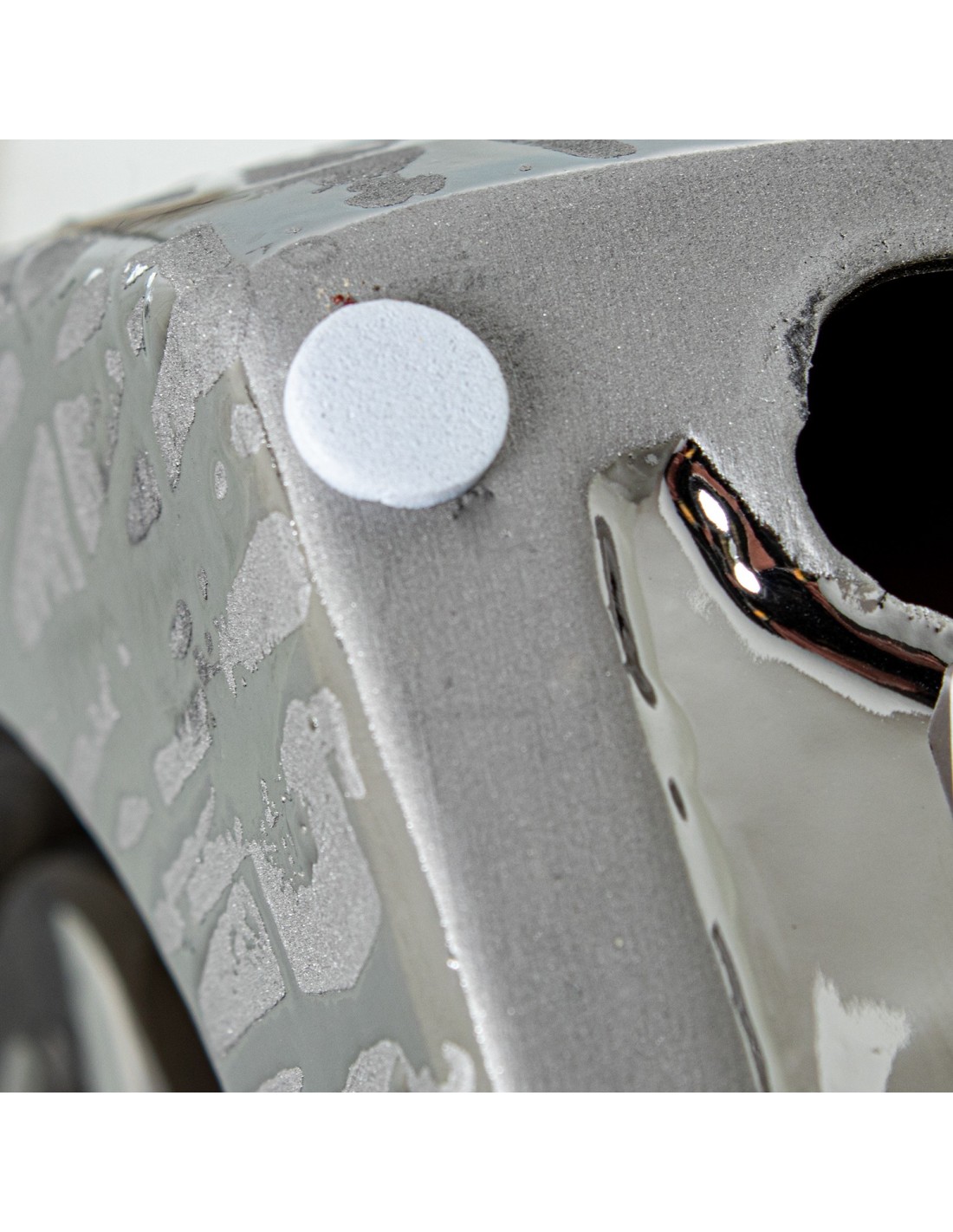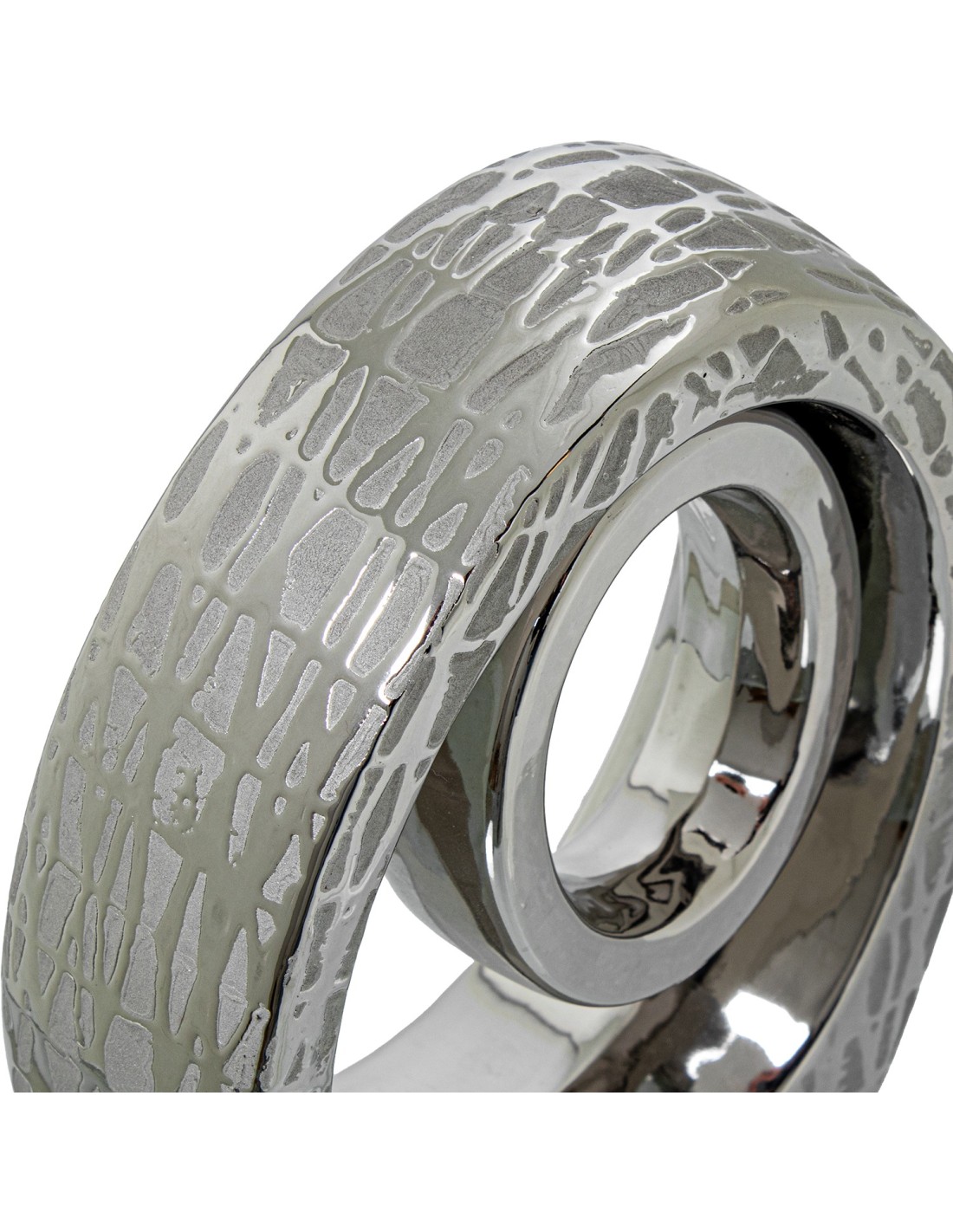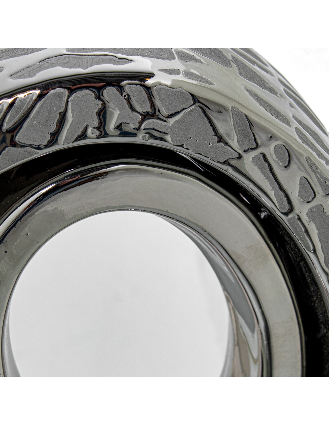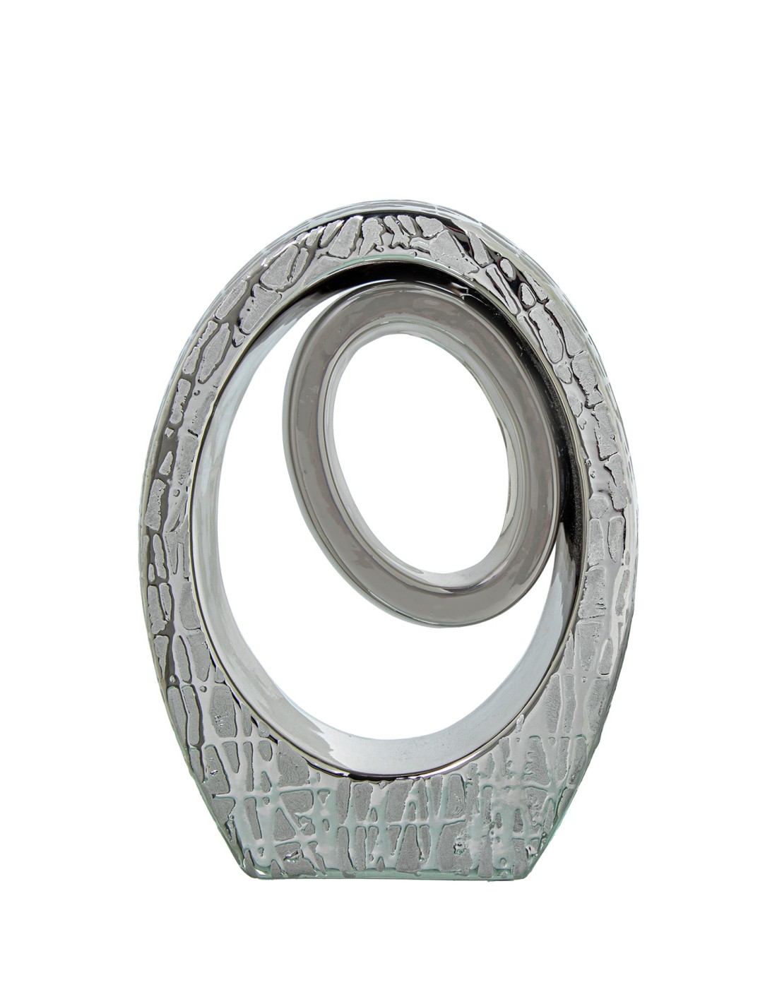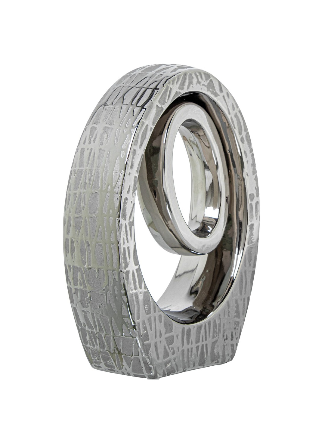 Fabricado en cerámica, este jarrón presenta un diseño abstracto con acabados en color plata y detalles brillantes que captan la luz y aportan dinamismo al espacio. Su estética contemporánea lo convierte en una opción perfecta para ambientes modernos, minimalistas o incluso decoraciones elegantes con un toque actual.