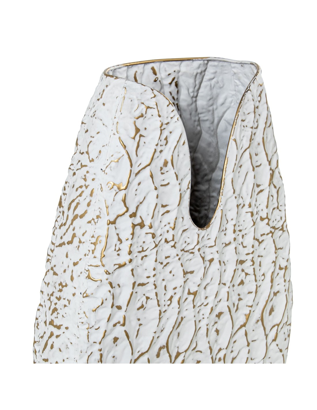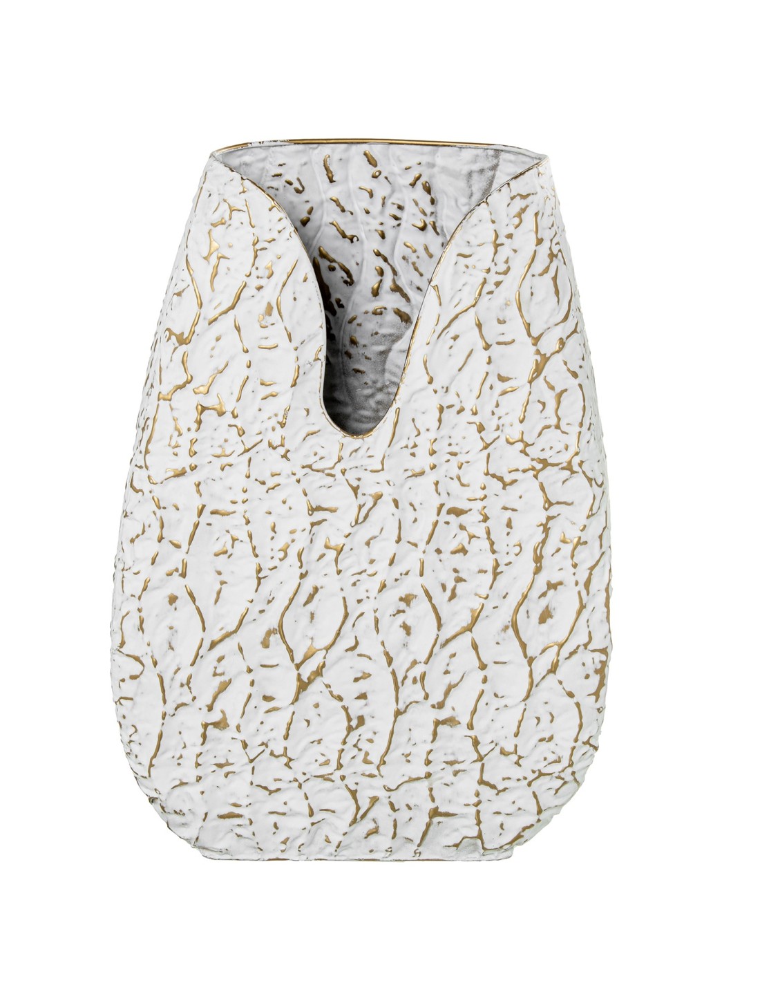 Elegante jarrón fabricado en metal con un diseño cortado moderno, pintado en color blanco y decorado con adornos en dorado. Su forma original y su acabado brillante lo convierten en una pieza decorativa ideal para aportar estilo y sofisticación a cualquier espacio del hogar.