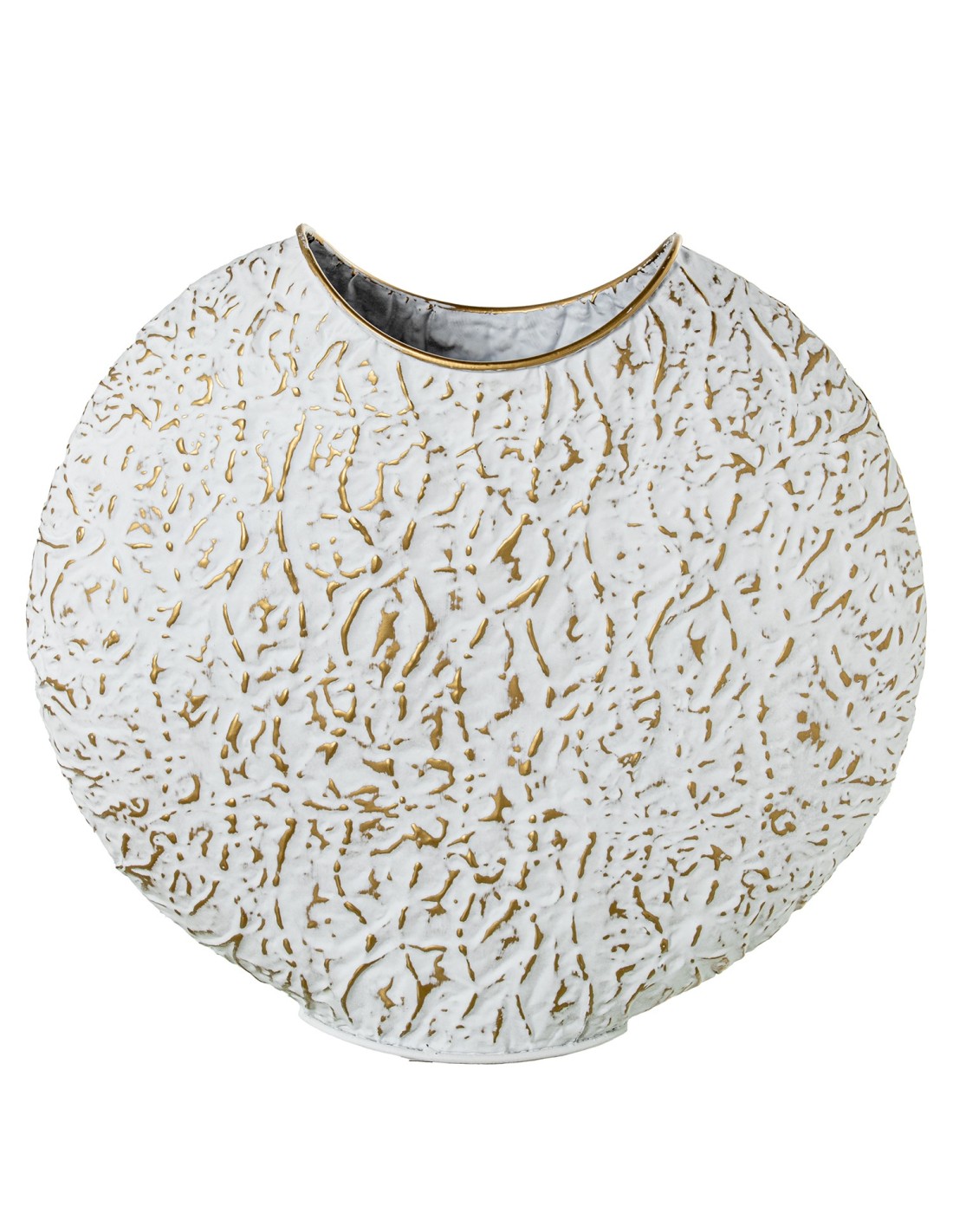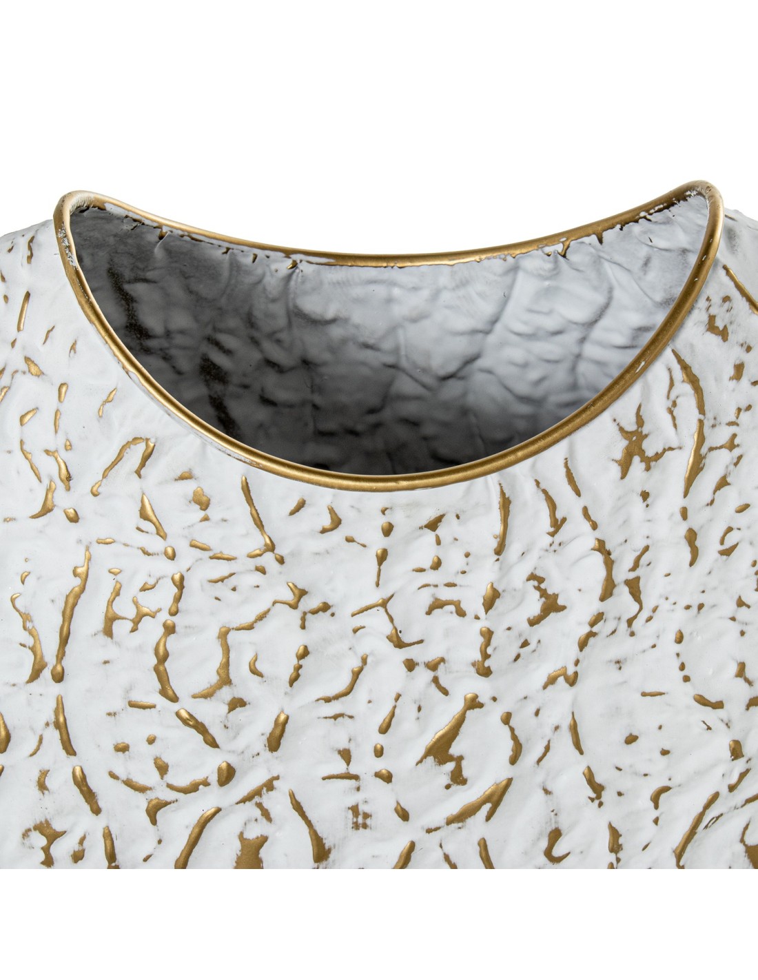 Aporta estilo y personalidad a tu hogar con este jarrón decorativo fabricado en metal, pintado en un elegante color blanco y decorado con adornos en dorado que realzan su diseño moderno. Su original boca cortada añade un toque contemporáneo y distintivo que lo convierte en una pieza única.