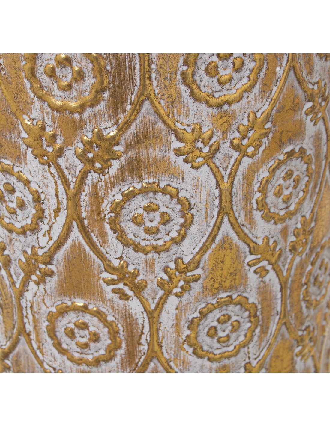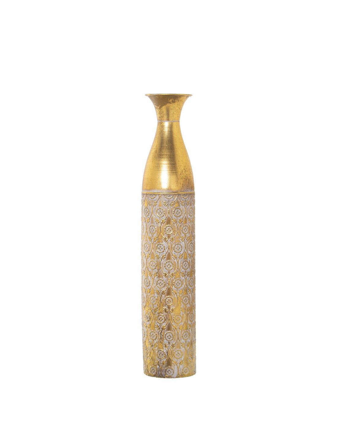 Este jarrón fabricado en metal en color dorado con adornos envejecidos es una pieza decorativa ideal para aportar elegancia y carácter a cualquier espacio. Con un diámetro de 14 cm y una altura de 71 cm, presenta un diseño estilizado y equilibrado que permite destacar sin recargar la decoración del ambiente.