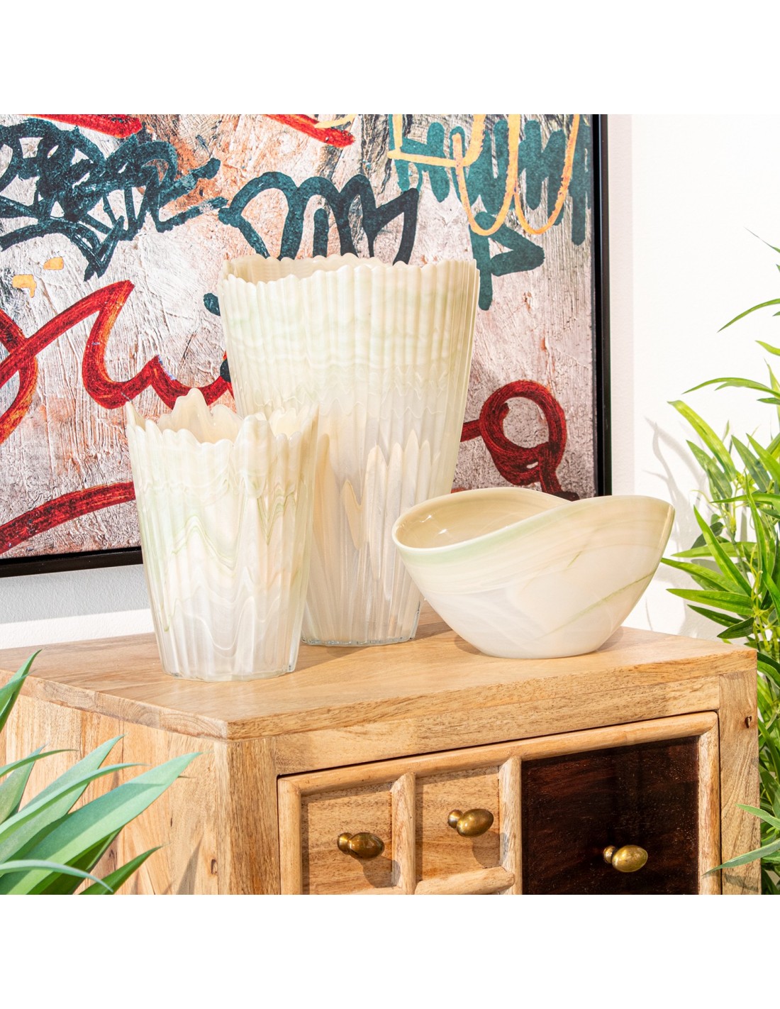 Jarrón fabricado en cristal con un diseño moderno y acabado pintado en color crema, ideal para añadir un toque elegante y actual a cualquier rincón de tu hogar. Perfecto para usar como florero o elemento decorativo.