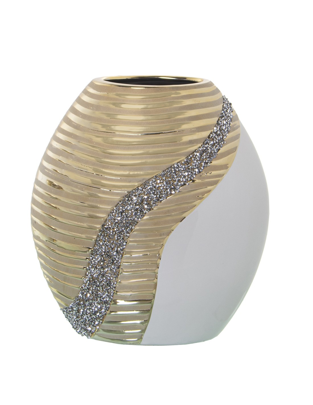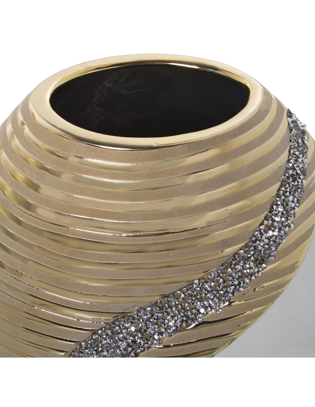 Este jarrón destaca por su excelente calidad de fabricación y por la armonía entre sus colores y texturas. La cerámica asegura resistencia y durabilidad, mientras que los detalles en champagne le aportan un matiz glamuroso sin resultar excesivo. La banda de cristalitos añade un toque de lujo que ilumina el ambiente sin perder la sutileza. Es una pieza versátil, fácil de integrar y adecuada para múltiples estilos decorativos como moderno, glam, minimalista o clásico renovado.