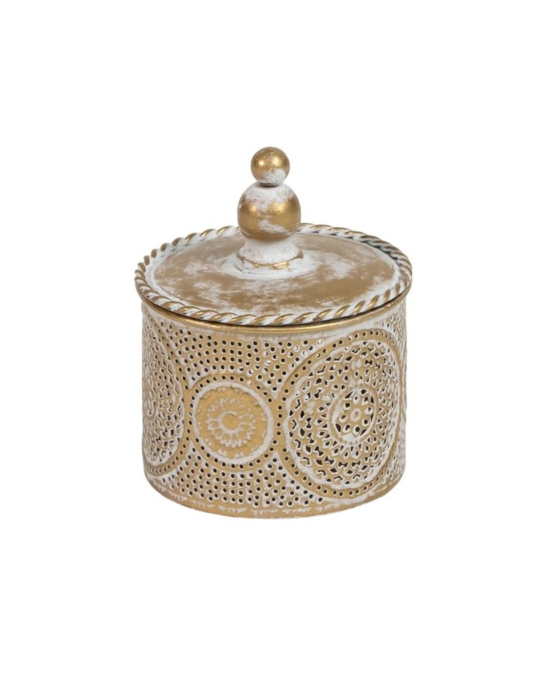 Esta elegante caja joyero pequeña está fabricada en metal con un delicado diseño arabesco calado y acabado en color oro envejecido, aportando un toque clásico y sofisticado a cualquier espacio.