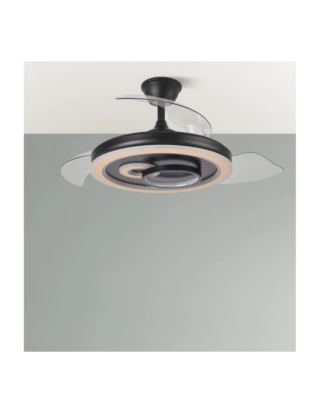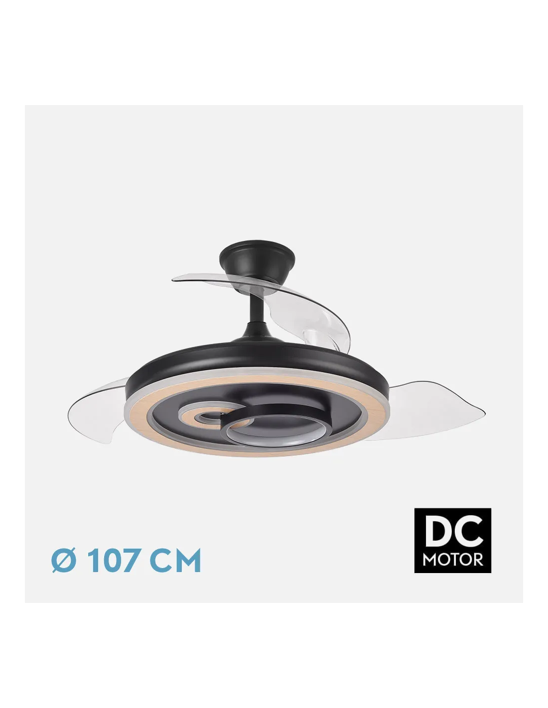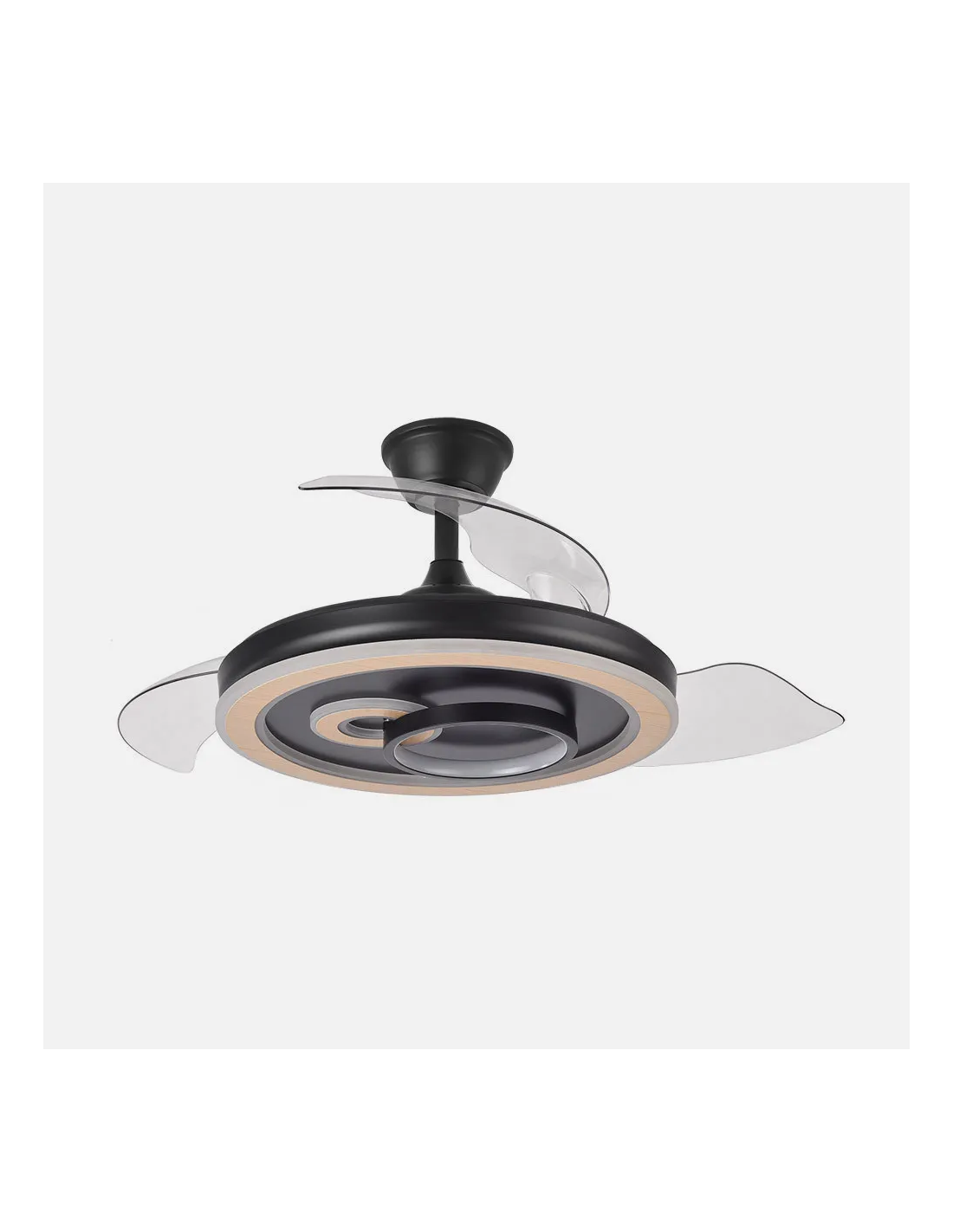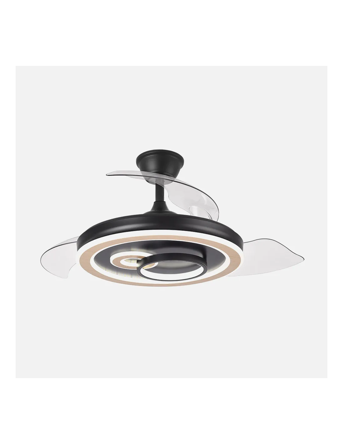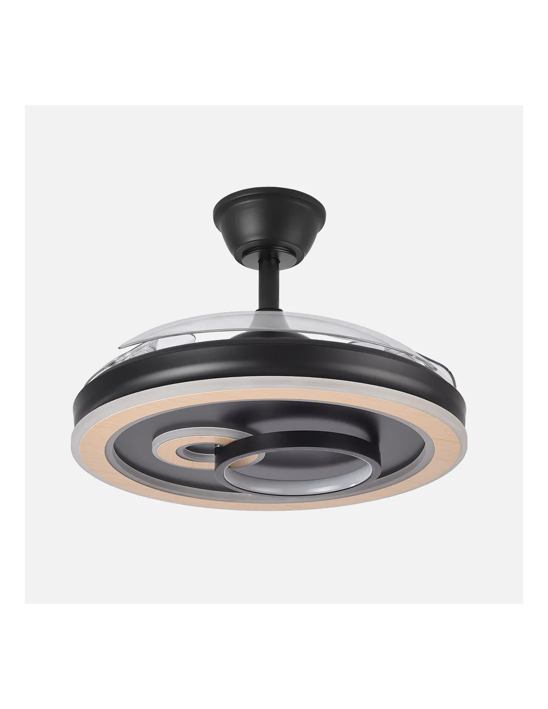 Este modelo destaca por su elegante combinación de color negro con acabado en madera, creando un contraste sofisticado que encaja a la perfección en ambientes modernos, industriales o contemporáneos. Su diseño minimalista y sus aspas retráctiles lo convierten en una pieza discreta y visualmente atractiva.