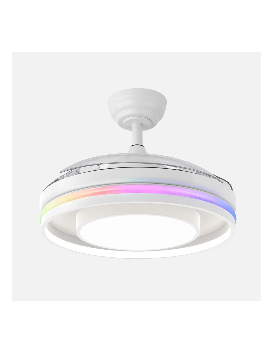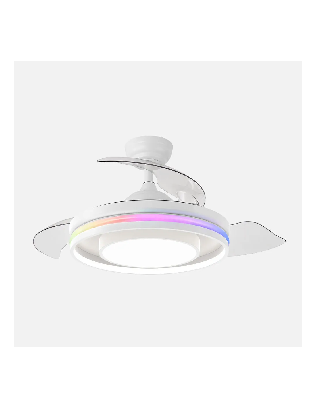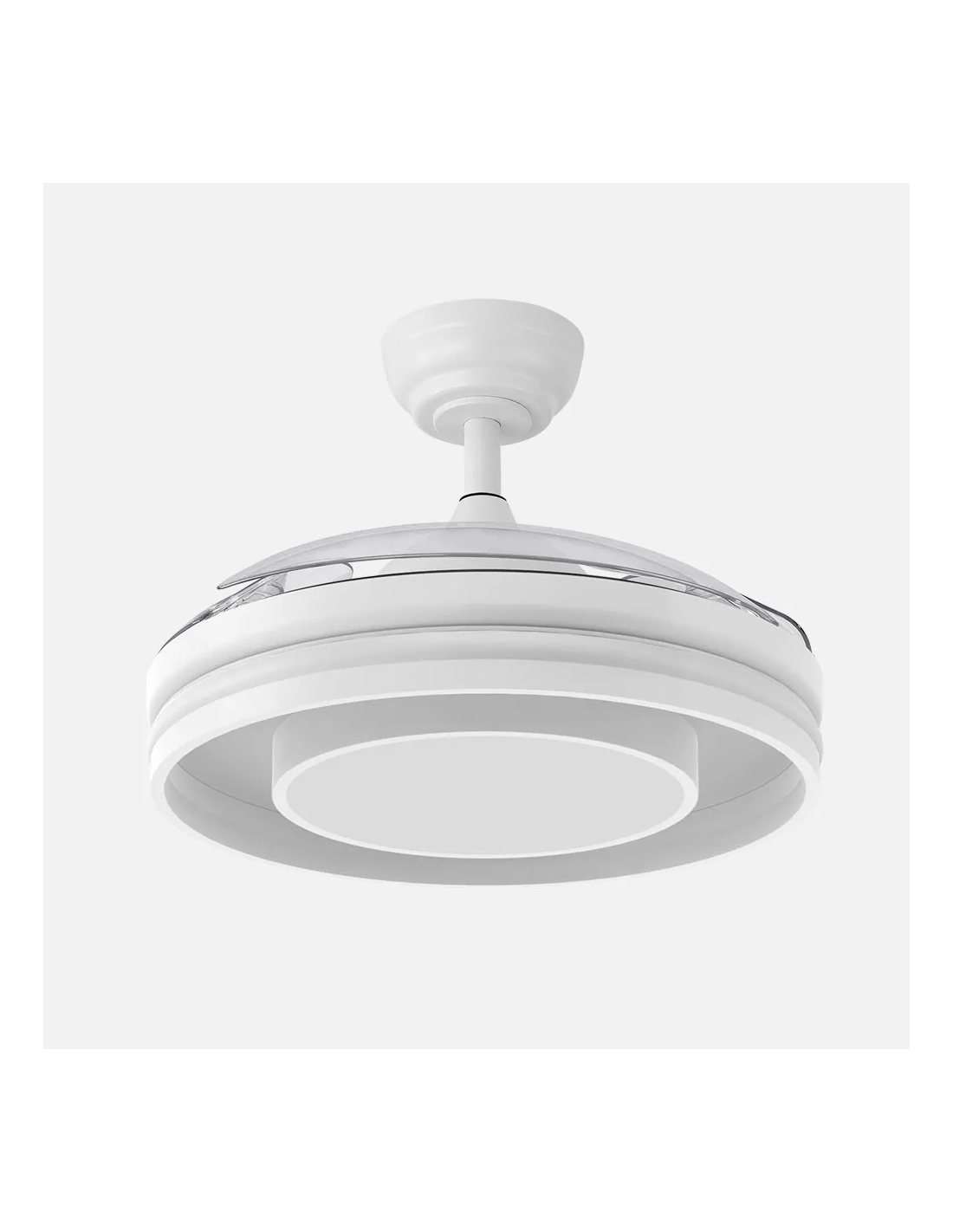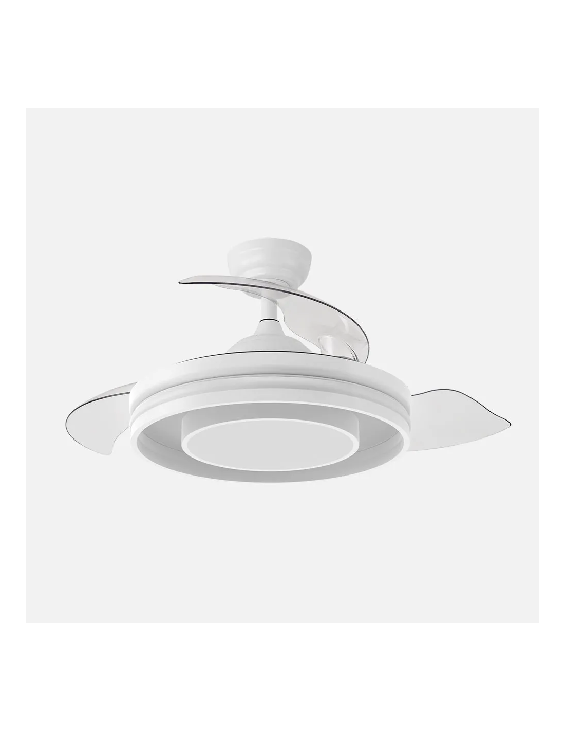 Este modelo destaca por su acabado en color blanco, que transmite limpieza, luminosidad y amplitud visual. Su diseño minimalista con aspas retráctiles lo convierte en una solución elegante y discreta cuando no está en funcionamiento.