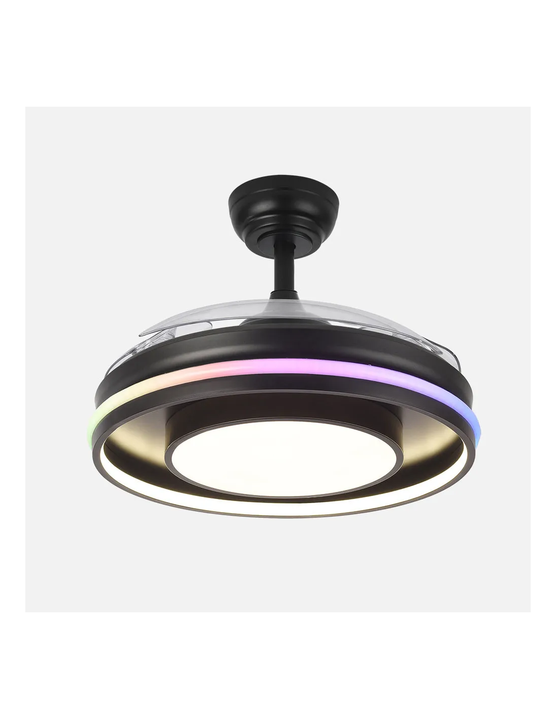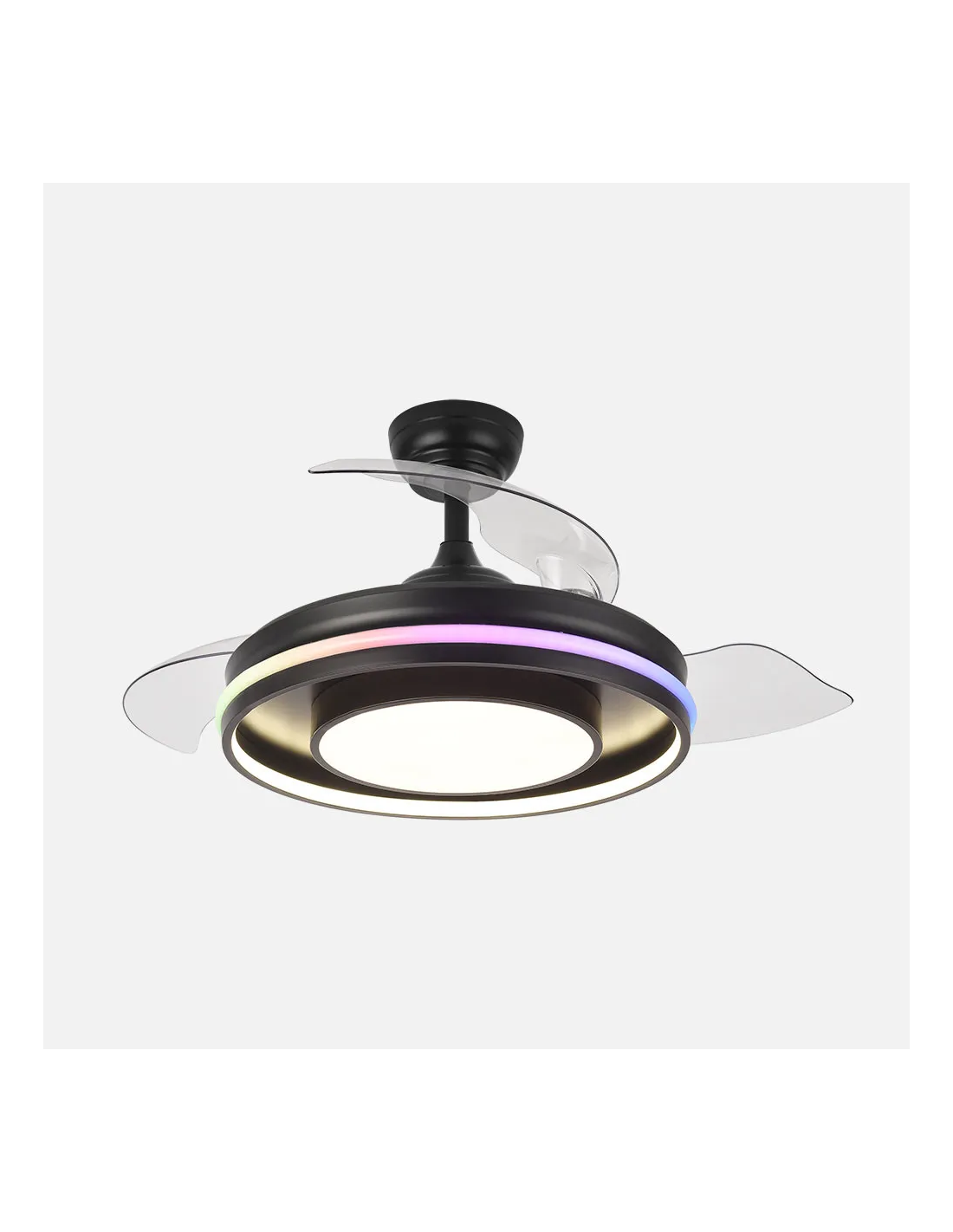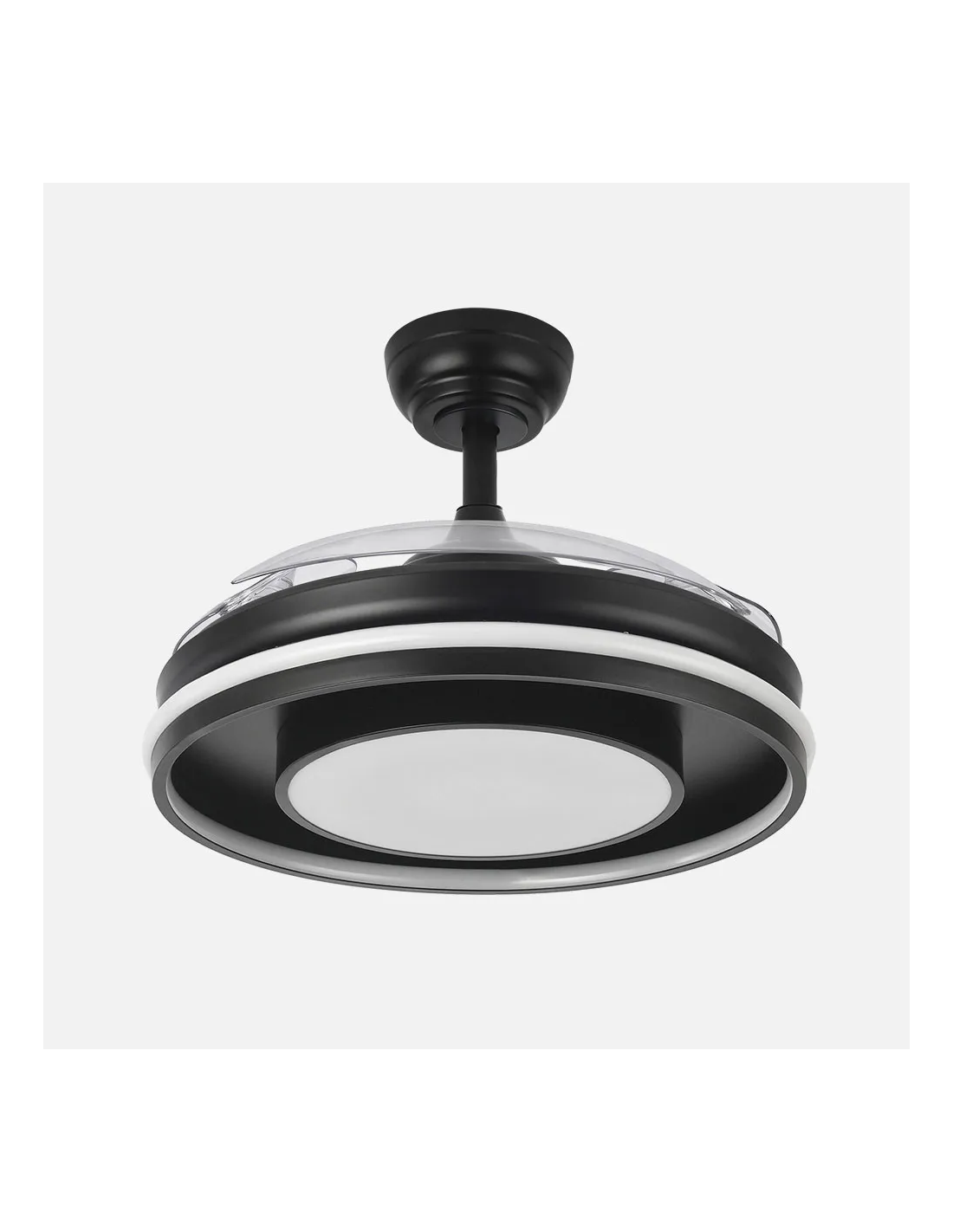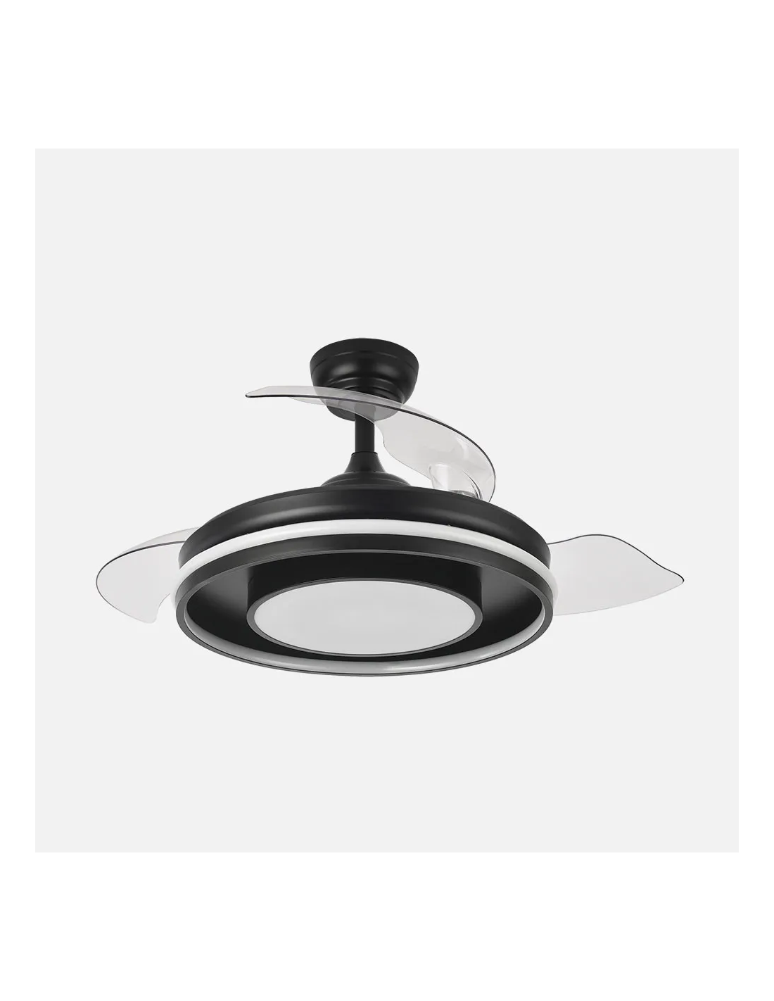 Este modelo destaca por su acabado en color negro, una elección sofisticada que aporta personalidad y modernidad al espacio. Su diseño minimalista con aspas retráctiles permite mantener una estética limpia cuando no está en funcionamiento.