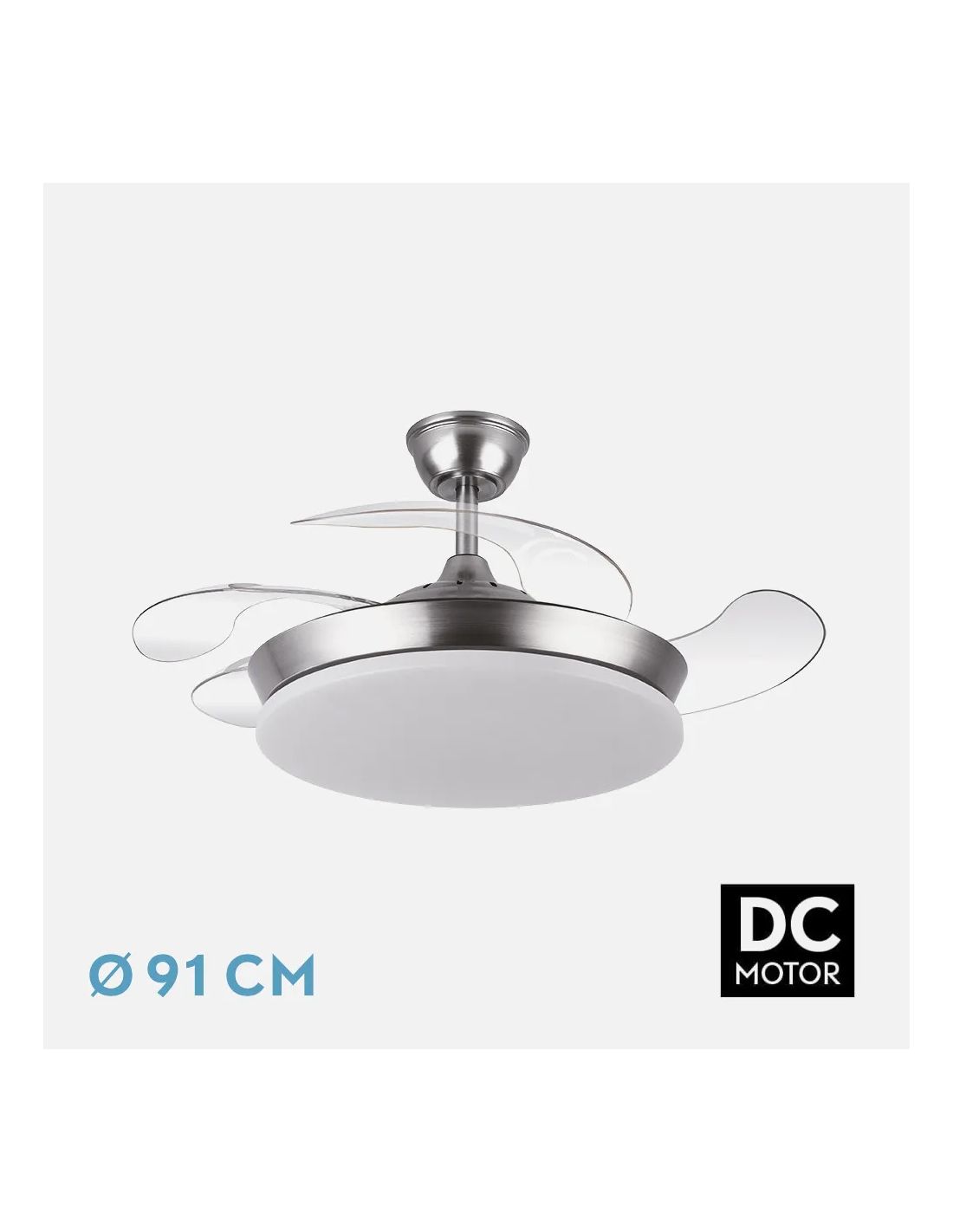 Con un diámetro de 91 cm cuando las aspas están abiertas y una altura de 40 cm, este ventilador está especialmente diseñado para estancias pequeñas o techos bajos. Además, incluye una lámpara integrada de 40 cm que proporciona una iluminación práctica y uniforme.